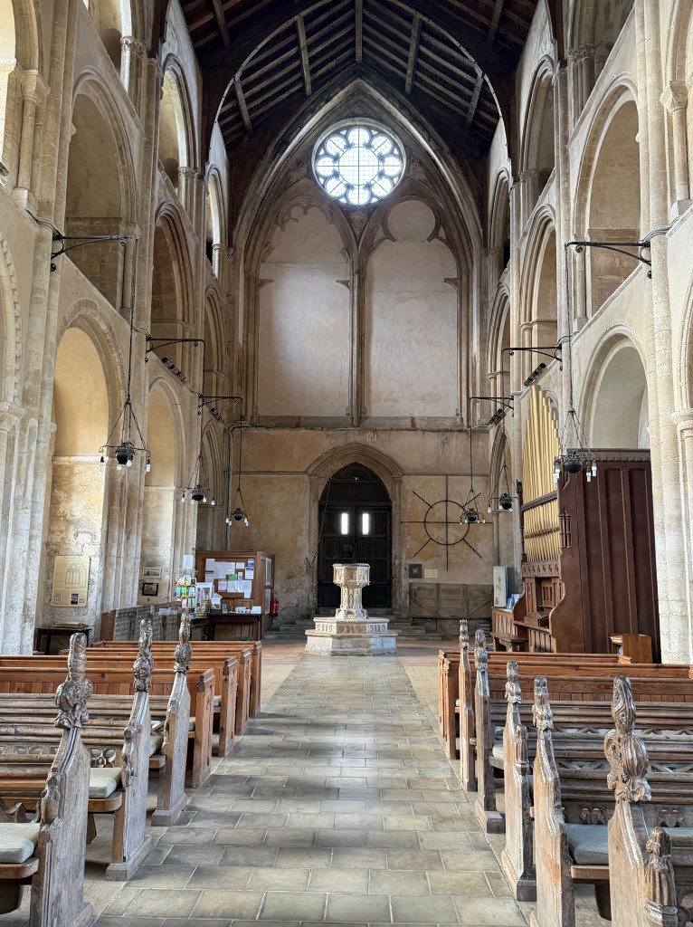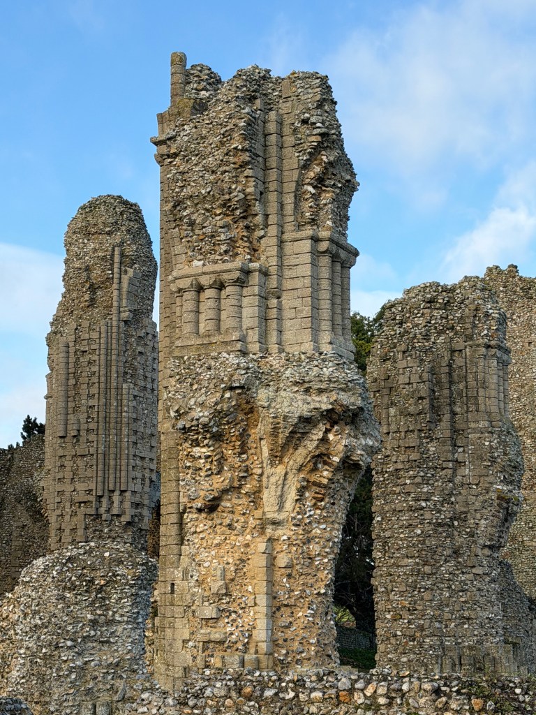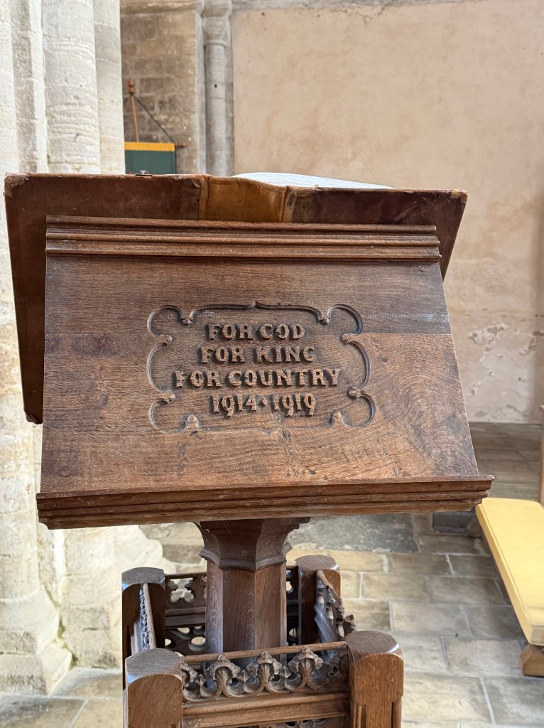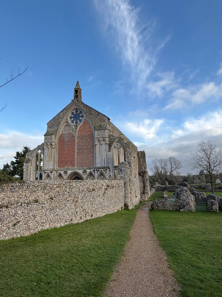Norfolk is dotted with these kinds of ruins – we have an awful lot of extant Wool Churches as well, but many of the old ruins that followed the dissolution remain wonderful places to visit – and each time I pick out something new to admire; this visit it was the lectern with its wording and the original iron frame for the round stained glass window on the wall behind the font – living, visible history.