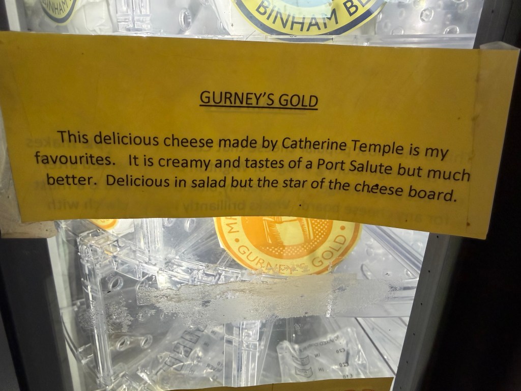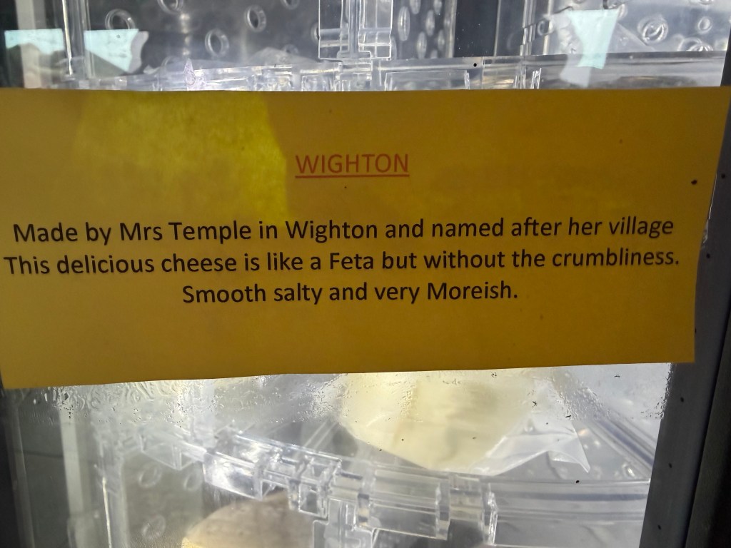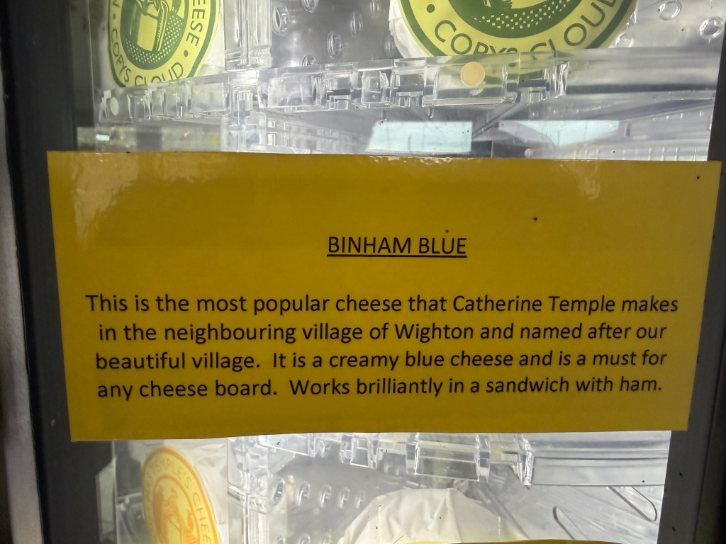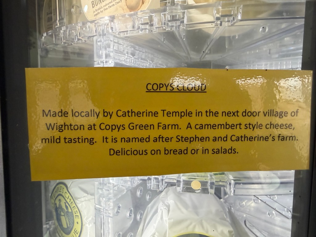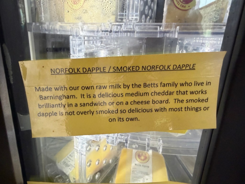 After a potter around the Ol Stuns, it was time for a coffee and a cake at The Binham Parlour. The Parlour is a very NICE place – and it seems to be loved by the Chelsea Tractor set – certainly judging in my mainly bitchy way, by the clothing worn by the clientele – when even a three year old is wearing designer clothes and boots – no, I am not joking, then you know the sort of people there! It’s a lovely place to stop though; attentive waiting staff and the food was very nice – I had a superb sausage roll – obviously prime quality pork mince with just seasoning in a very good crust. The other reason for visiting the parlour is the cheese machine…. I have spoken before of the selection of cheese that’s local to us but just look at the variety !