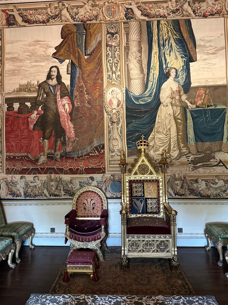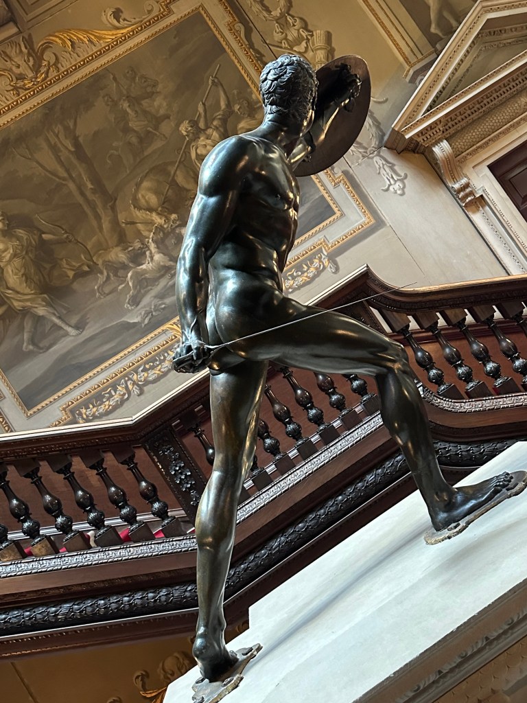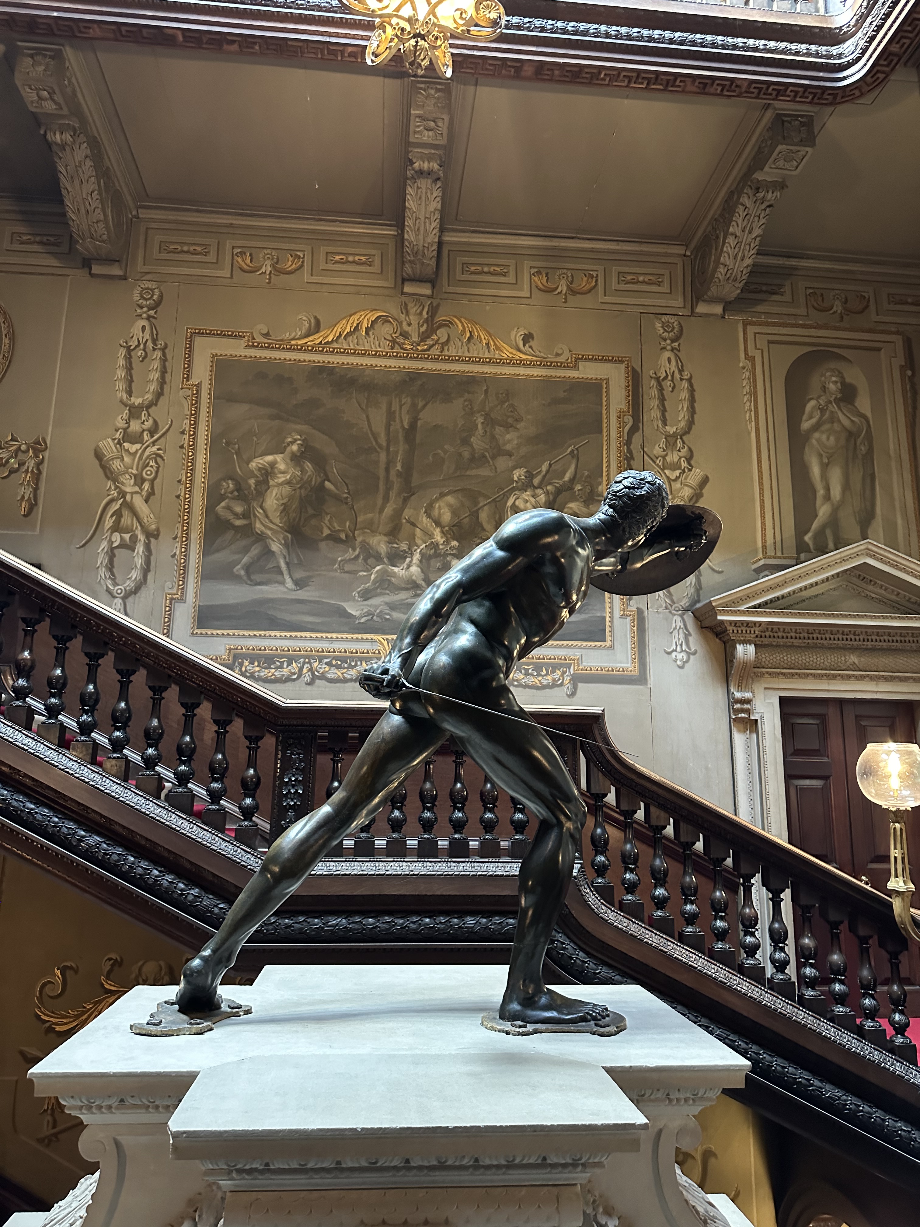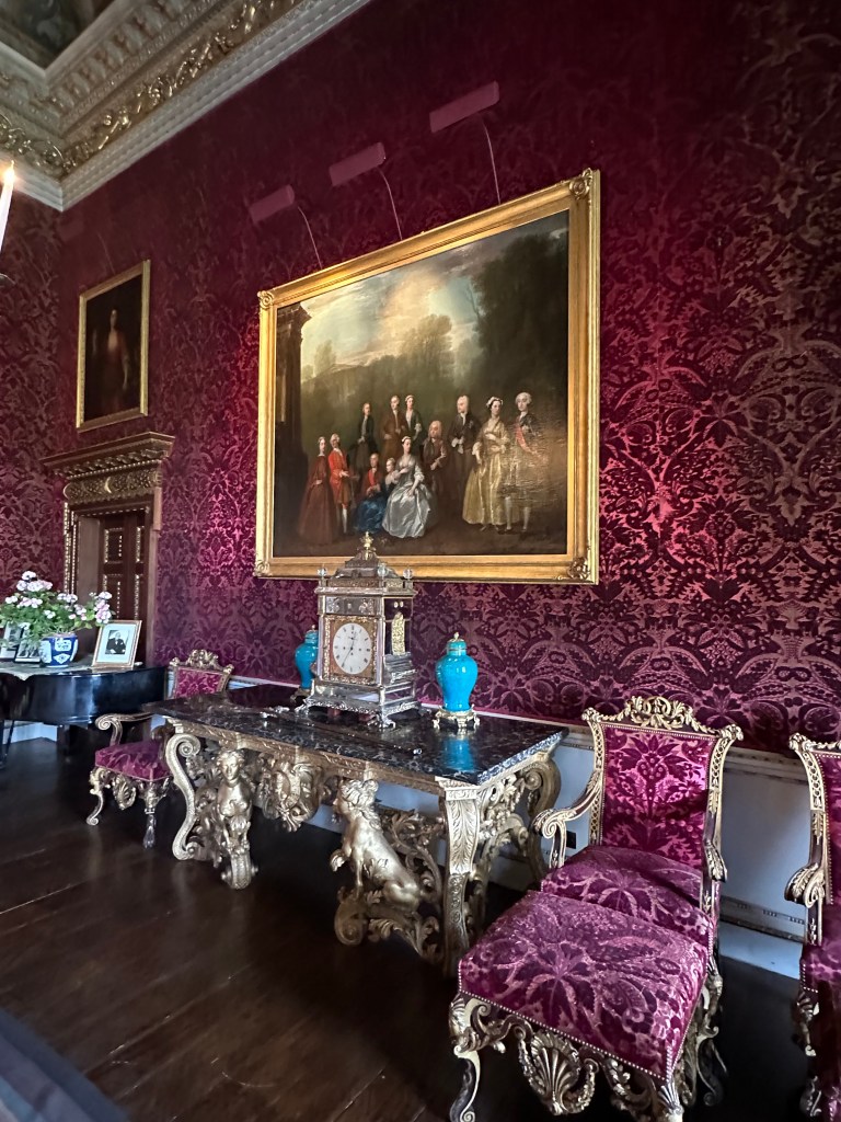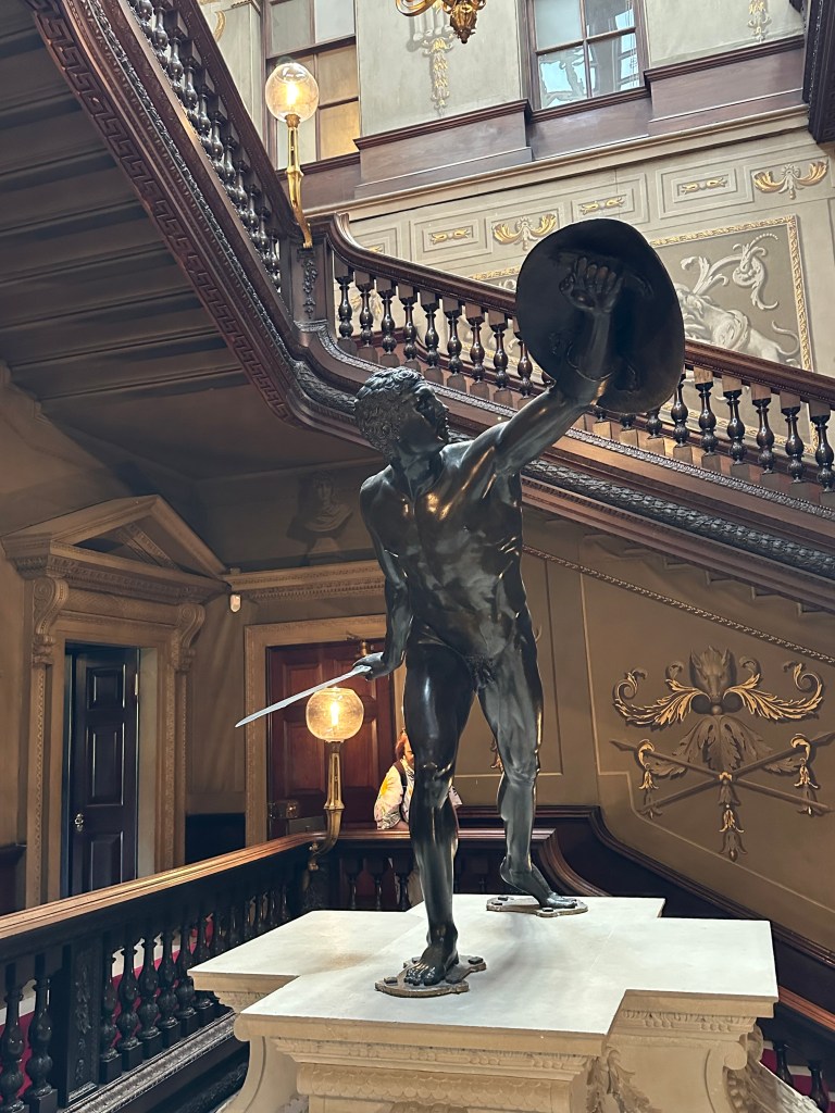 The main rooms are difficult to try and describe – and the photographs I took cannot do it justice being honest – currently all the rooms have some modern additions as a part of a visiting artist’s work. There was also a piece of her work in a room in the range, which I did like, but the jury is out for me! One of the fascinating items for me was the consort’s and Prince of Wales’ state thrones -they live at Houghton until needed at Westminster etc…. The final thing of note is the wonderful Gladiator statue at the bottom of the main stairs – a stunning piece of art.
