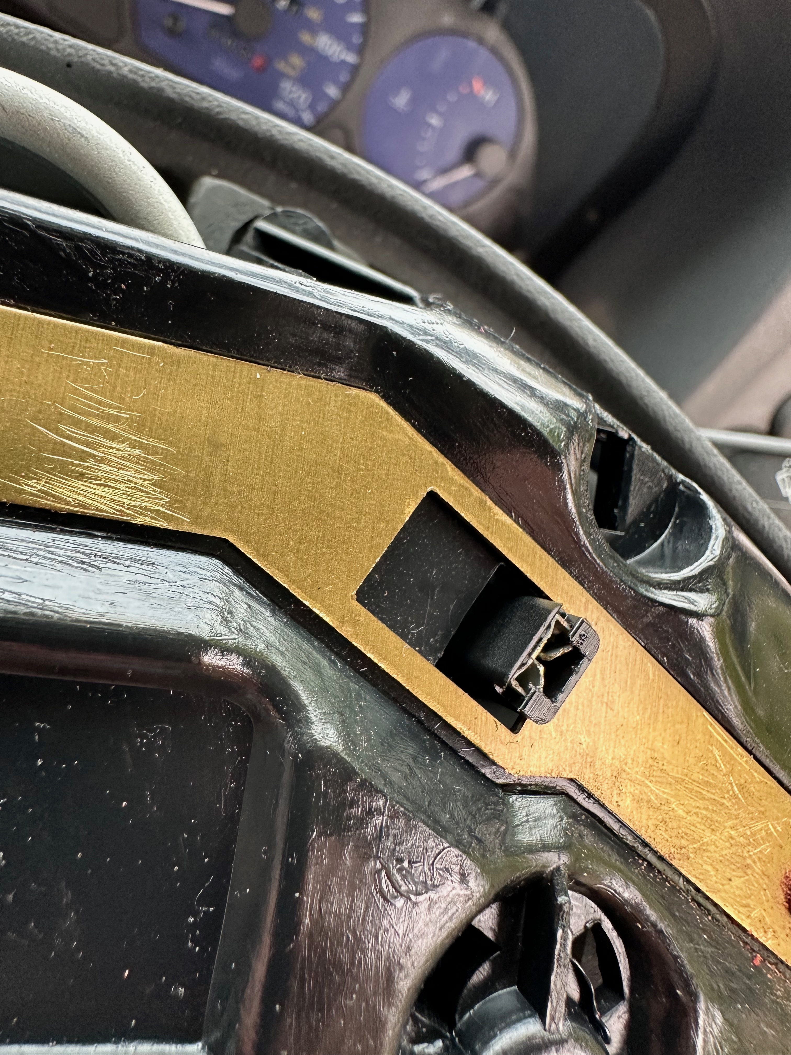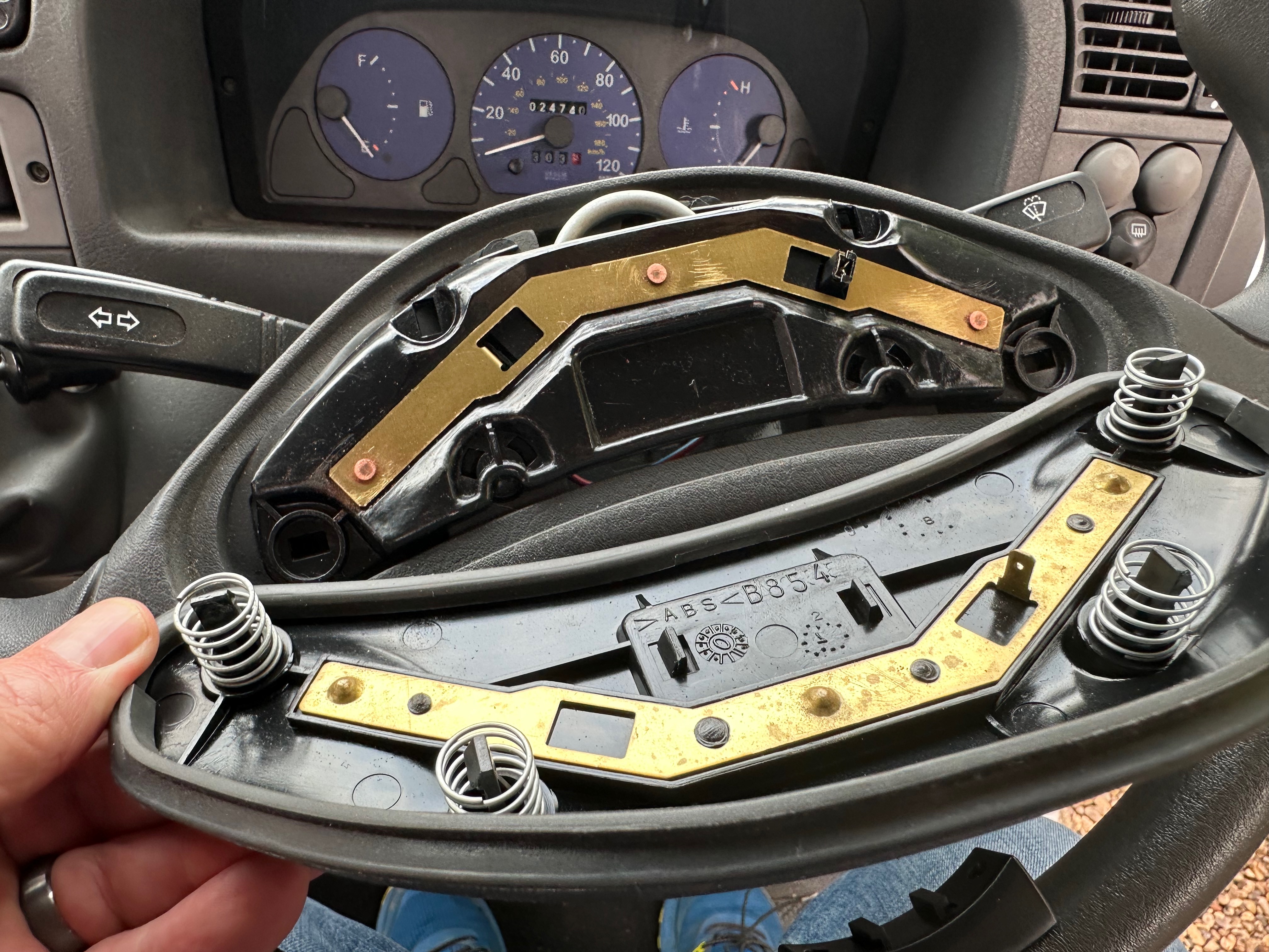 Taking the steering wheel off is no actual biggie in my opinion – and can be done easily at home with very few tools – mainly a 24mm socket / ratchet set. First get the steering set straight, then carefully pry up and off the horn – BEWARE there are two electrical connectors under it, so go easy tiger…..