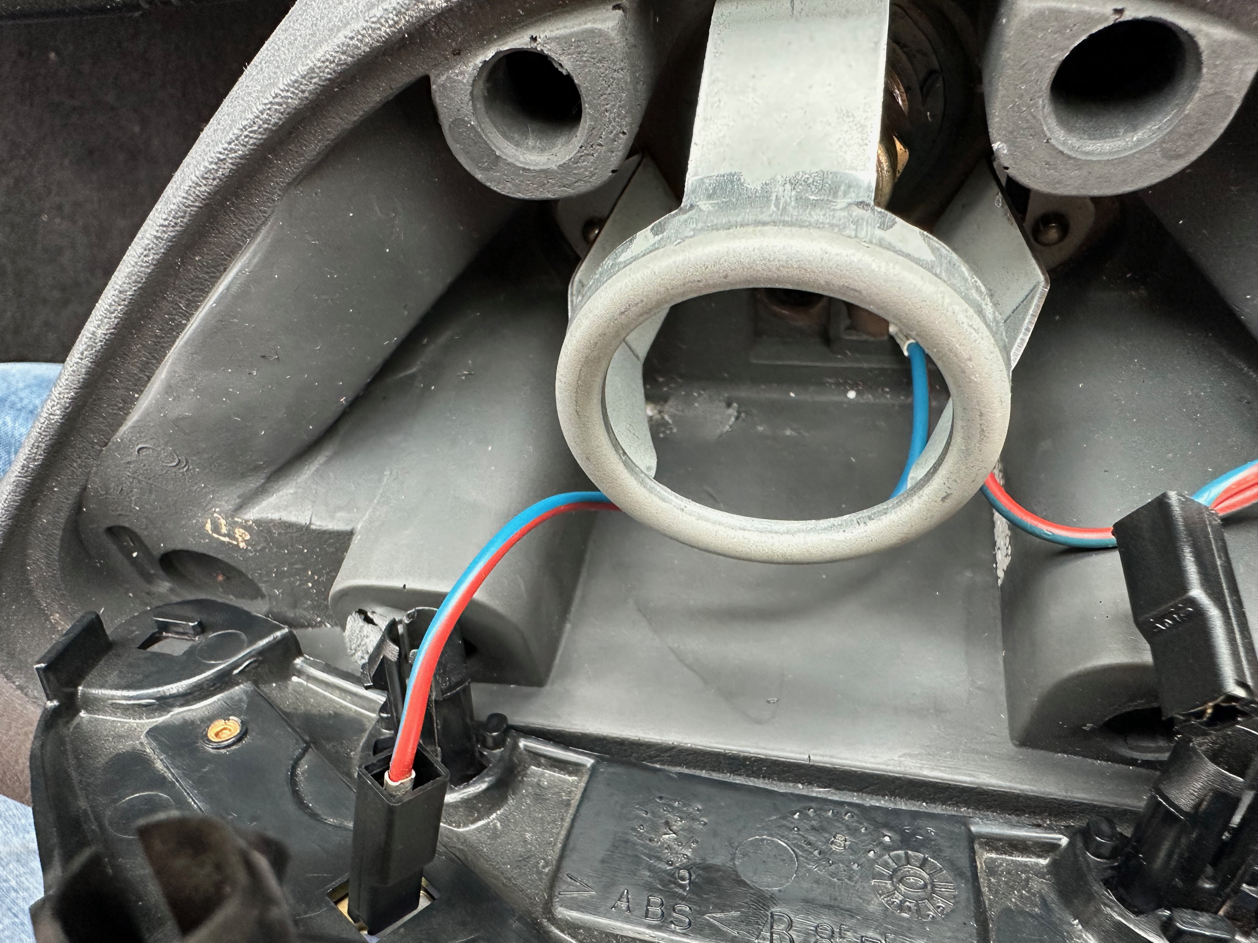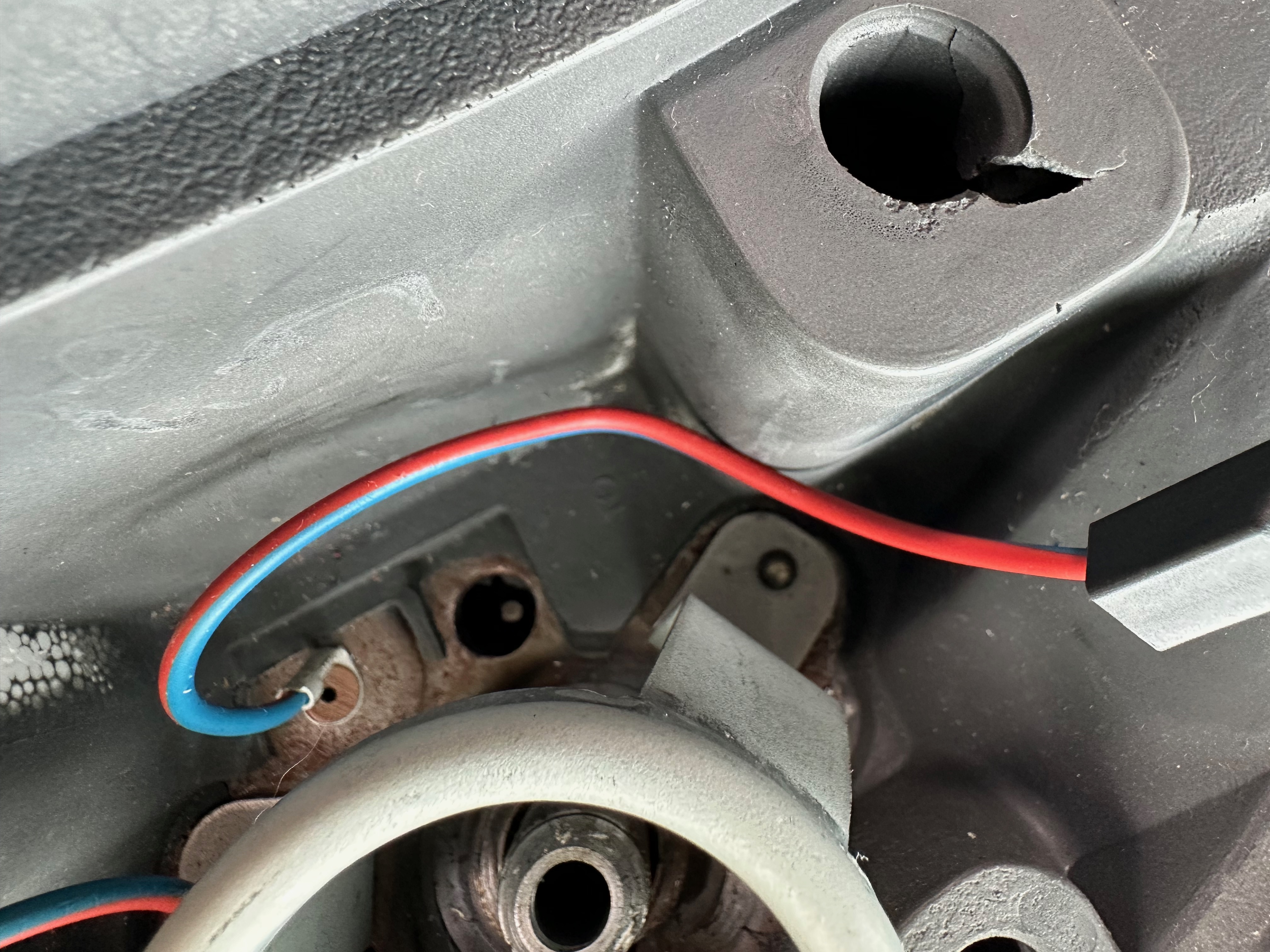 Here you can see the two sides of the horn, and one of the connectors through the horn switch – please note, that as I have the horn apart, I have not only given the exposed copper a bit of a clean, but also a light sanding to aid connectivity.