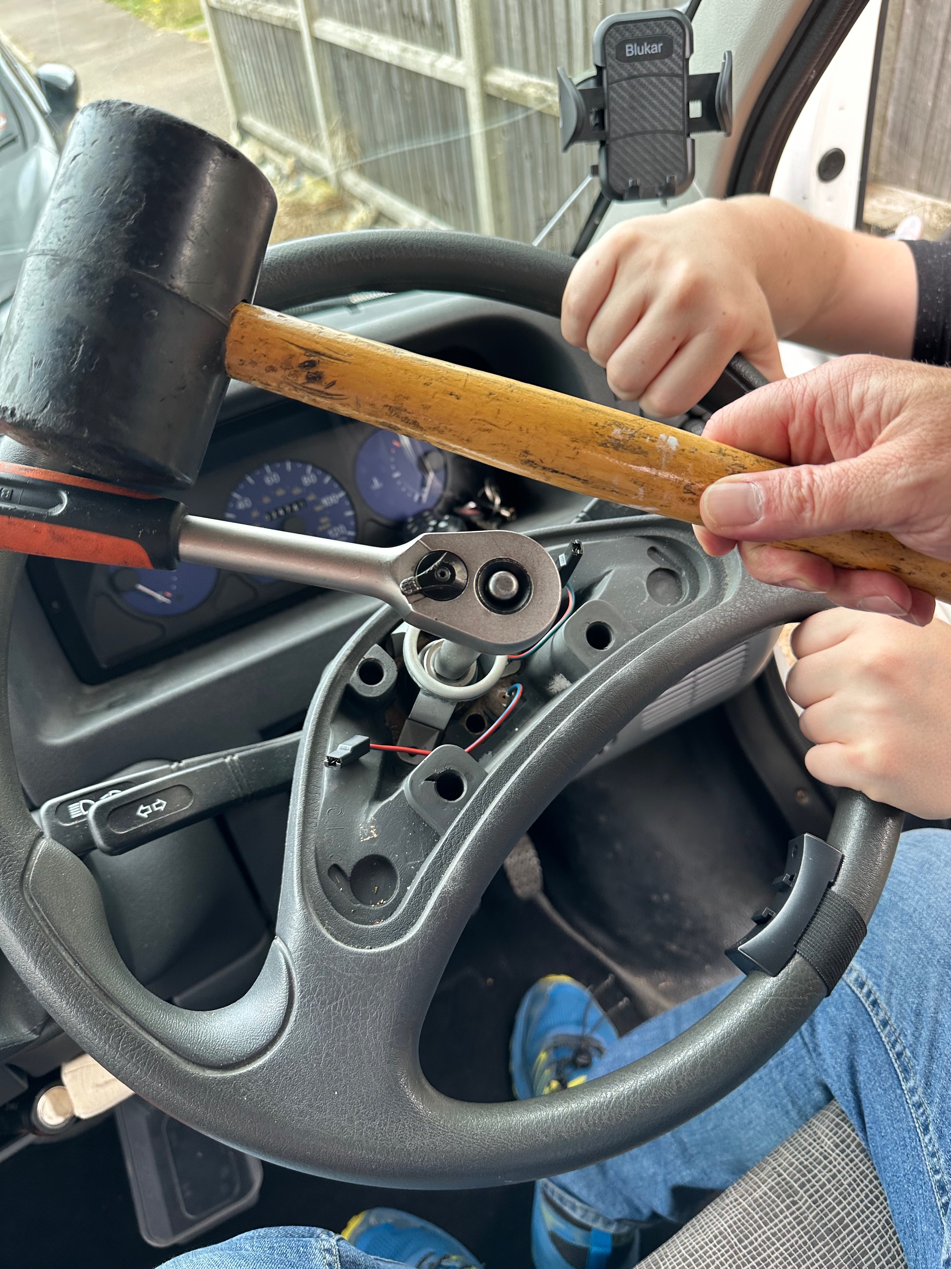 Once that is removed, then you can see the nut that literally holds the steering wheel on. The nut size is 24mm so use a 24 socket with a short extension bar and then your ratchet. Now – you are unlikely to get this undone on your own…. so, calling for the aid of Sulk senior, I got his to hold the steering wheel, while I got some tension onto the ratchet – and then hit the ratchet bar with a rubber mallet – the shock will break the seal of the nut and then you can undo it. DO NOT TAKE IT OFF TOTALLY – unless of course you like to hurt yourself…. Let me explain, the wheel is still, even with no nut on, stuck on the pawls of the steering column – now you can get all gorilla on it and yak upwards a few times but, you will smack the steering wheel into your face – I wonder how I found out…. so – when the nut is loose, then loosen the wheel – if needs be with a tap from the rubber mallet – when its loose, then take the nut off and then left the wheel off.