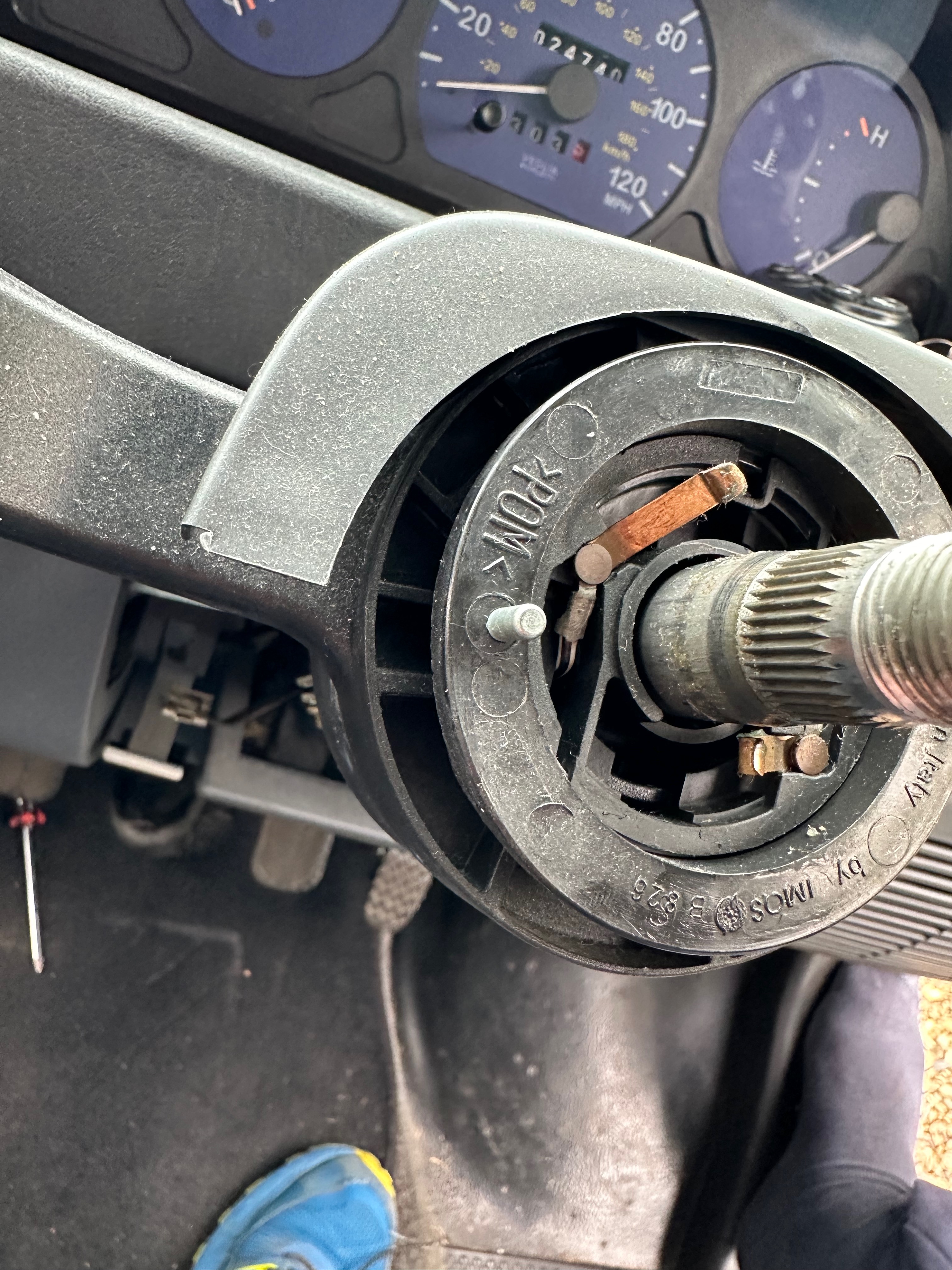 As soon as the wheel was off, I could see the problem….. at the Bottom of the steering wheel, at 6 o clock is a hole – and the self cancelling works by a pin lodging in the hole – as the wheel turns, it cancels the switch – simple, but effective – but look here: