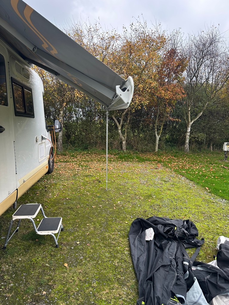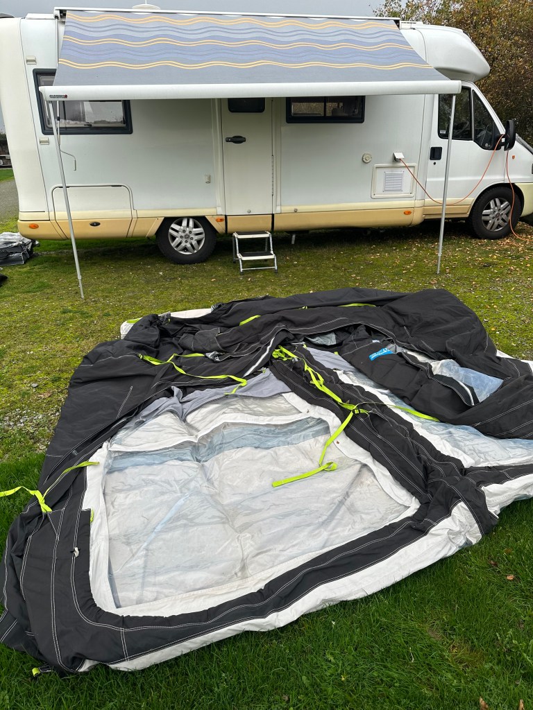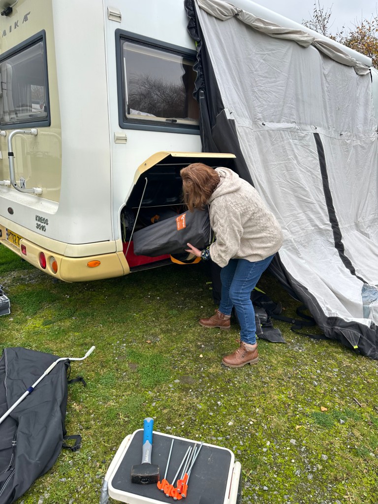 Once threaded on, close the roll out awning – its also a good idea to check the ground where the awning is going to go – even though we use a carpet, its always good to remove assorted rockets etc. Another important tip is to remove everything that you are going to need from the side lockers that will be covered by the awning – in our case the starboard side of ziggy’s garage is where our table and chairs live !