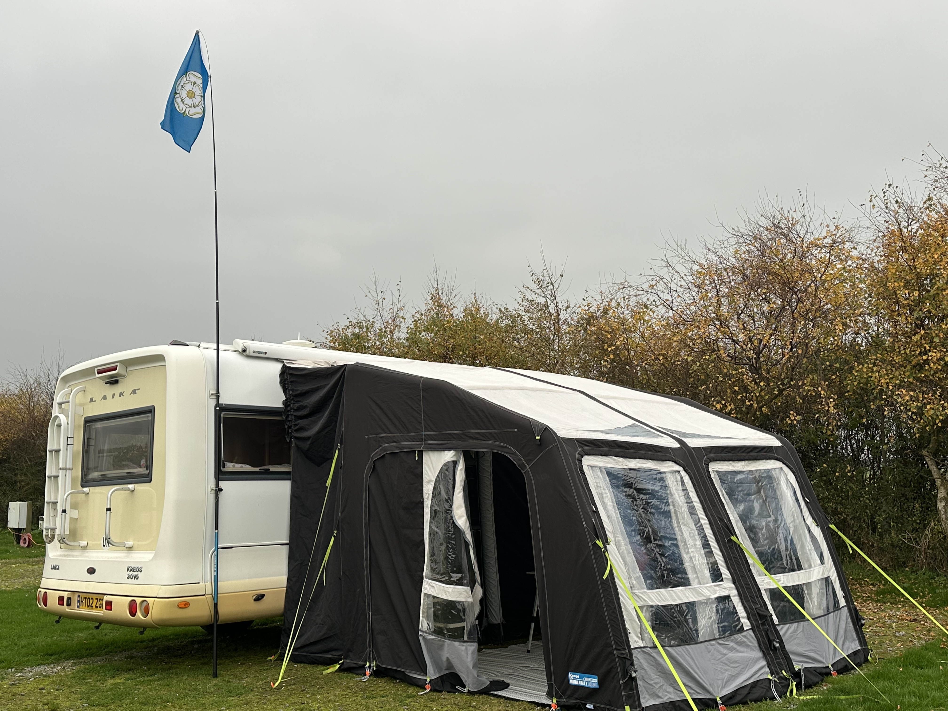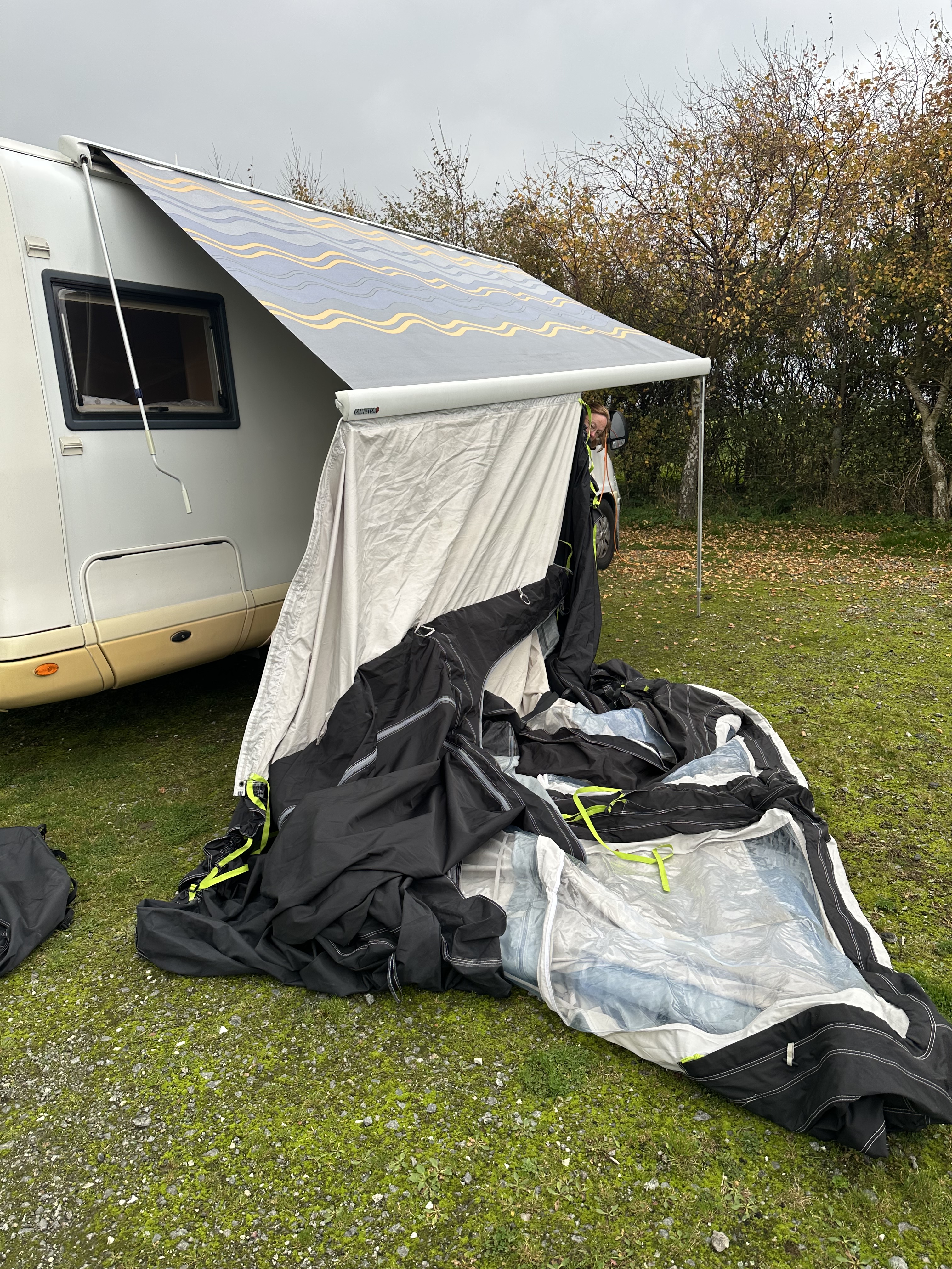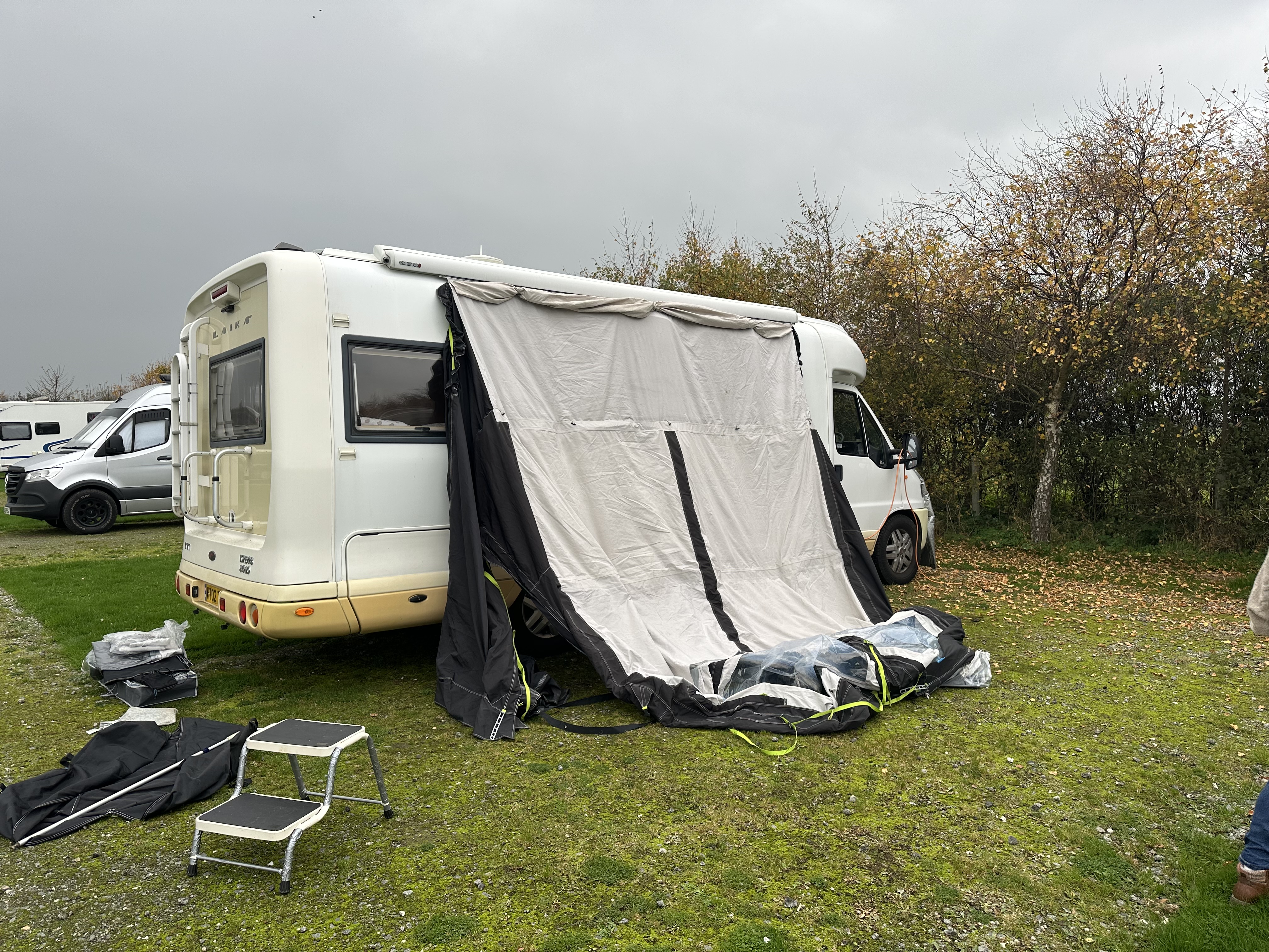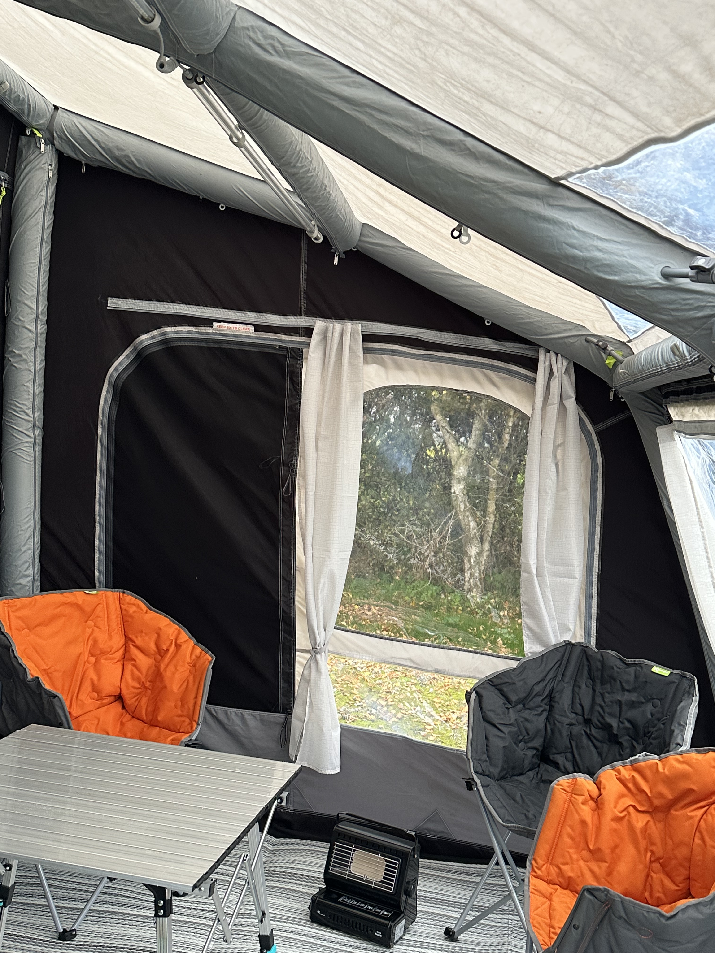 We are lucky enough to have the correct carpet for the awning, and we also decided on this instance to equip the lights and the curtains – with the aid of a couple of fan heaters, it was alll set for the evening meal with our friends.