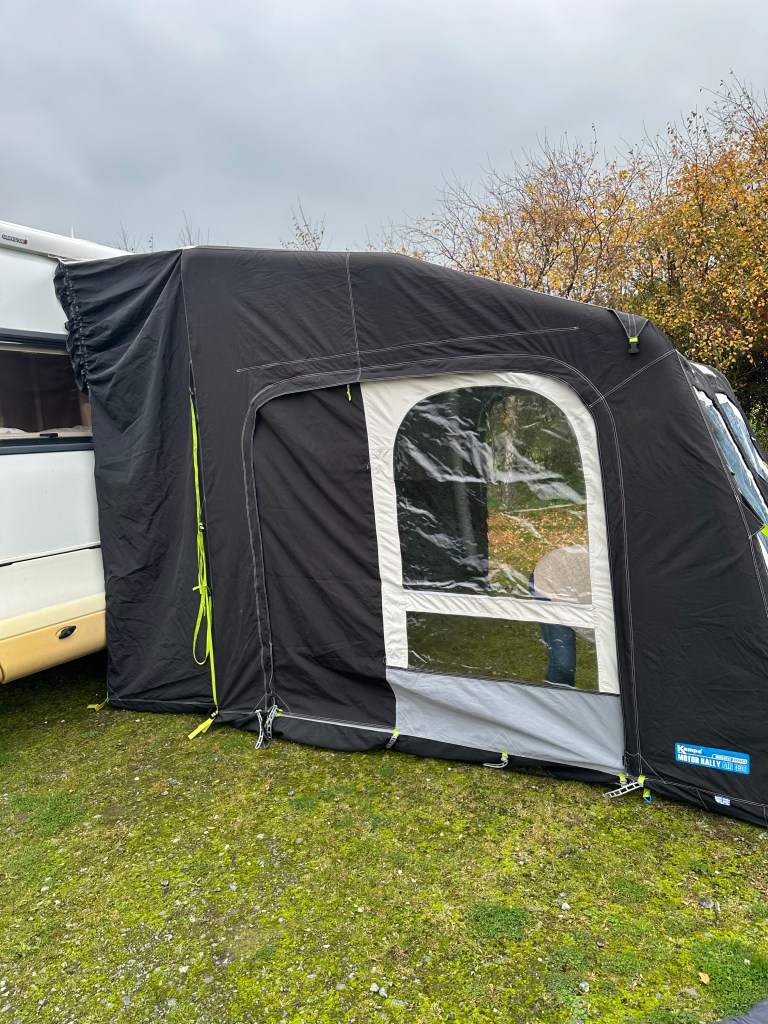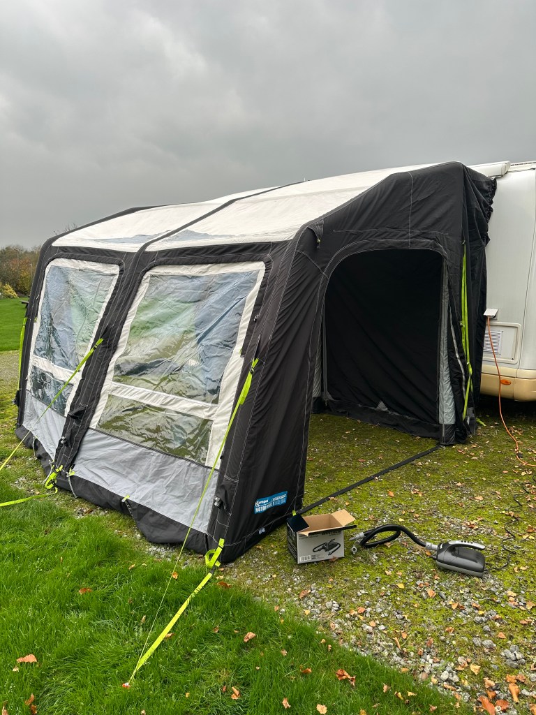 now, once you have the awning up against the side of the Moho, then you can either peg out under the side, or inflate, then start to peg out – personally I prefer to inflate it first; Also, note in the pictures that I have deliberately removed the sides from the awning – this allow me to easily see the position of the floor straps and make sure that right angles are formed – also, I don’t fully inflate straight away – I use an electric pump and i inflate to about 7 psi – thi gives the awning rigidity while also b wing loose enough to sort out any tangles – and ensure that the strips are tucked under the feet. Once I am happy, I fully inflate and put the doors in.
