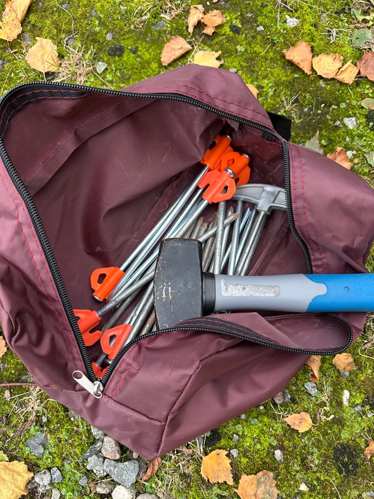 Now, you can buy rubber mallets fro tenting purposes – and most awnings come with a selection of plastic or simple pegs – I would suggest that you carefully put those away in a bin or cupboard at home – and get a proper bloody lump hammer and some storm pegs – I routinely carry a bag with 30 or so in.