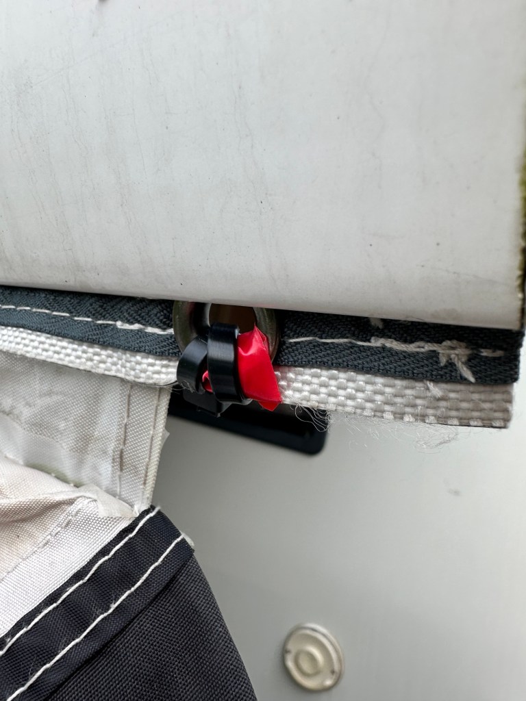 The next day I wanted to set up our air awning as Steve and Diane would be dining a la Ziggy, and we wanted the space. So – a few lessons learnt on how to put up an air awning. The biggest lesson AND solution came from Steve – yet again we initially put the sodding thing on the rail, inside out – brilliantly Steve suggested that adding a red tie or similar meant you would not make that mistake again – its now done – Insulating tape and a cable tie applied!