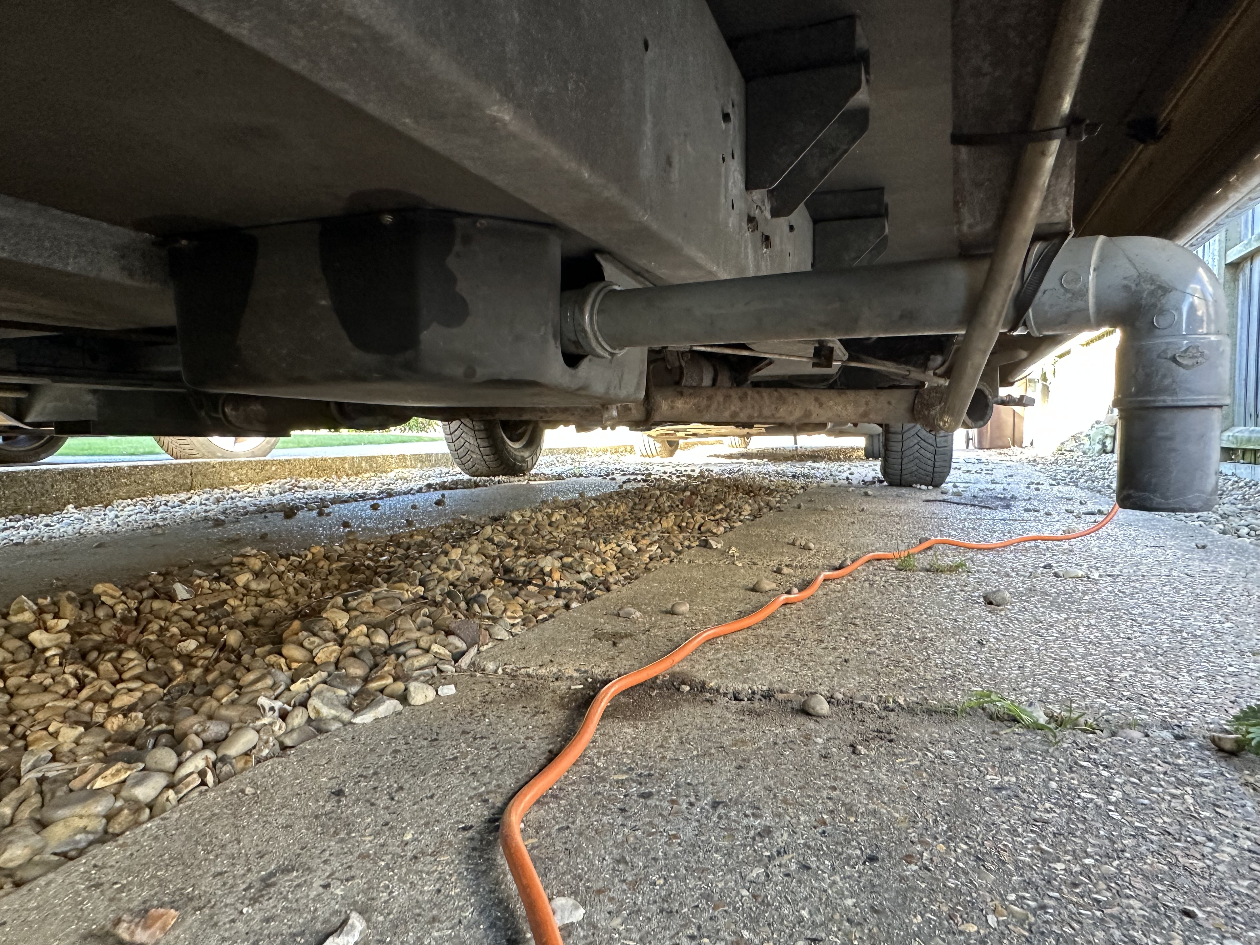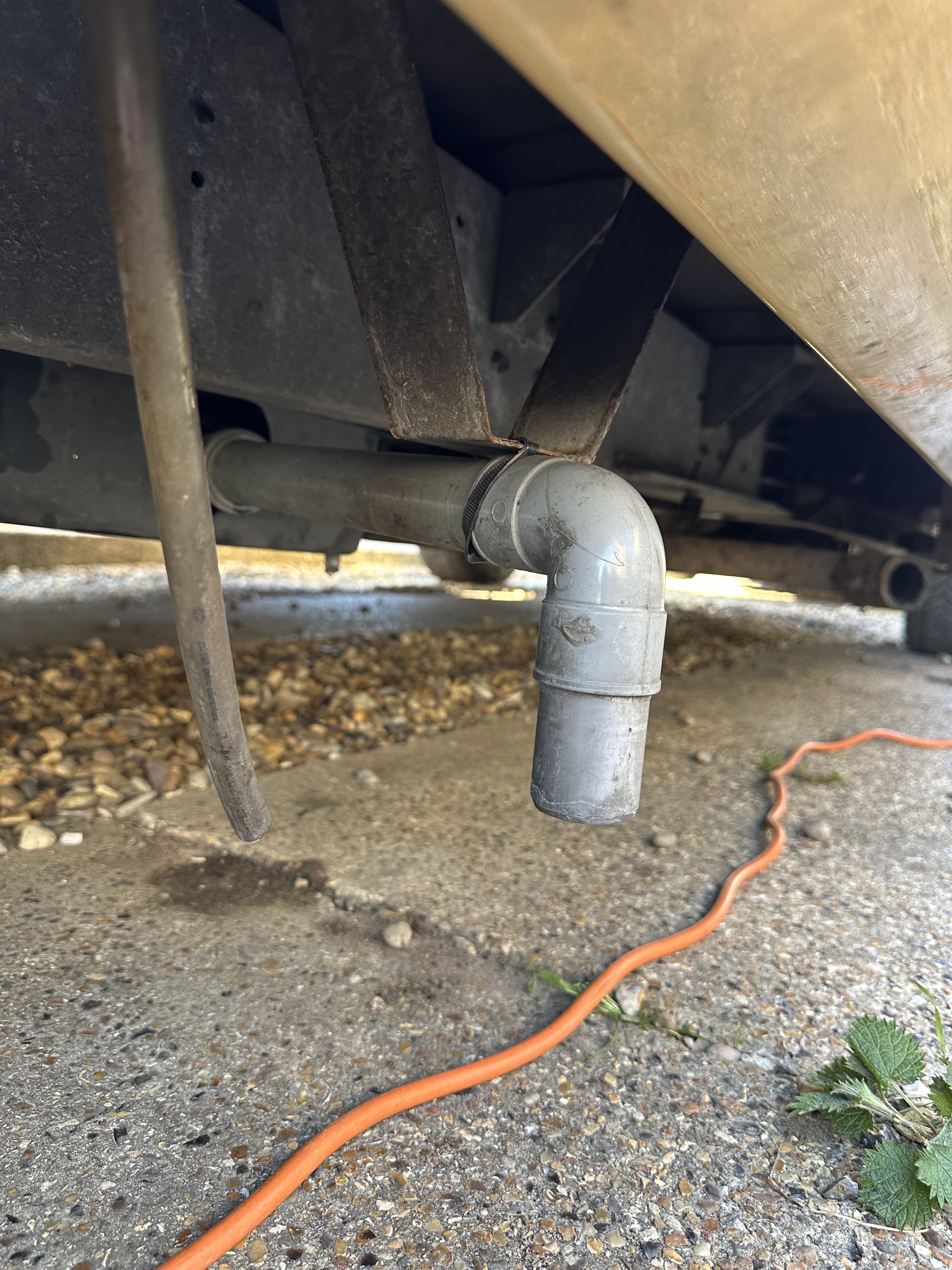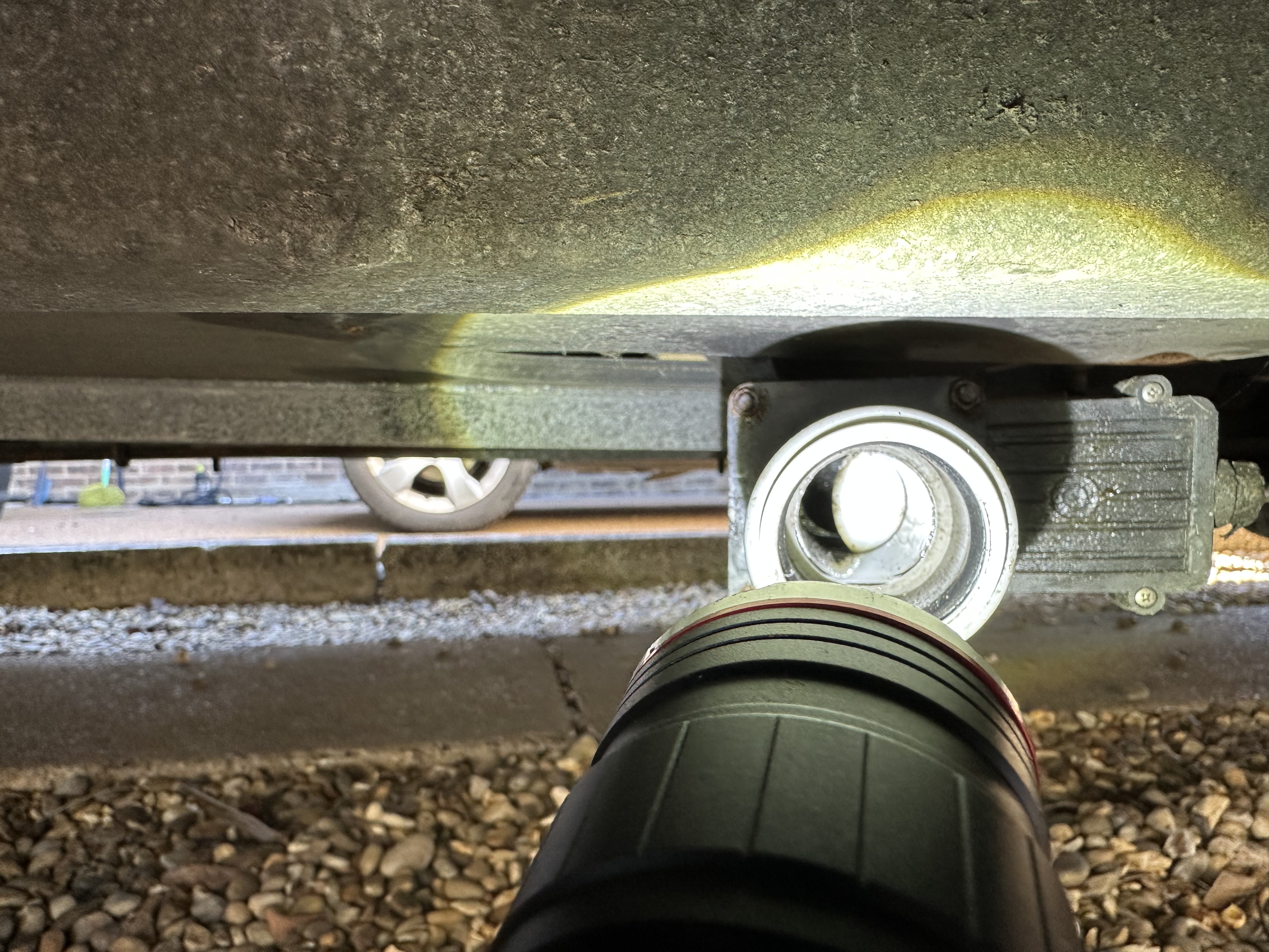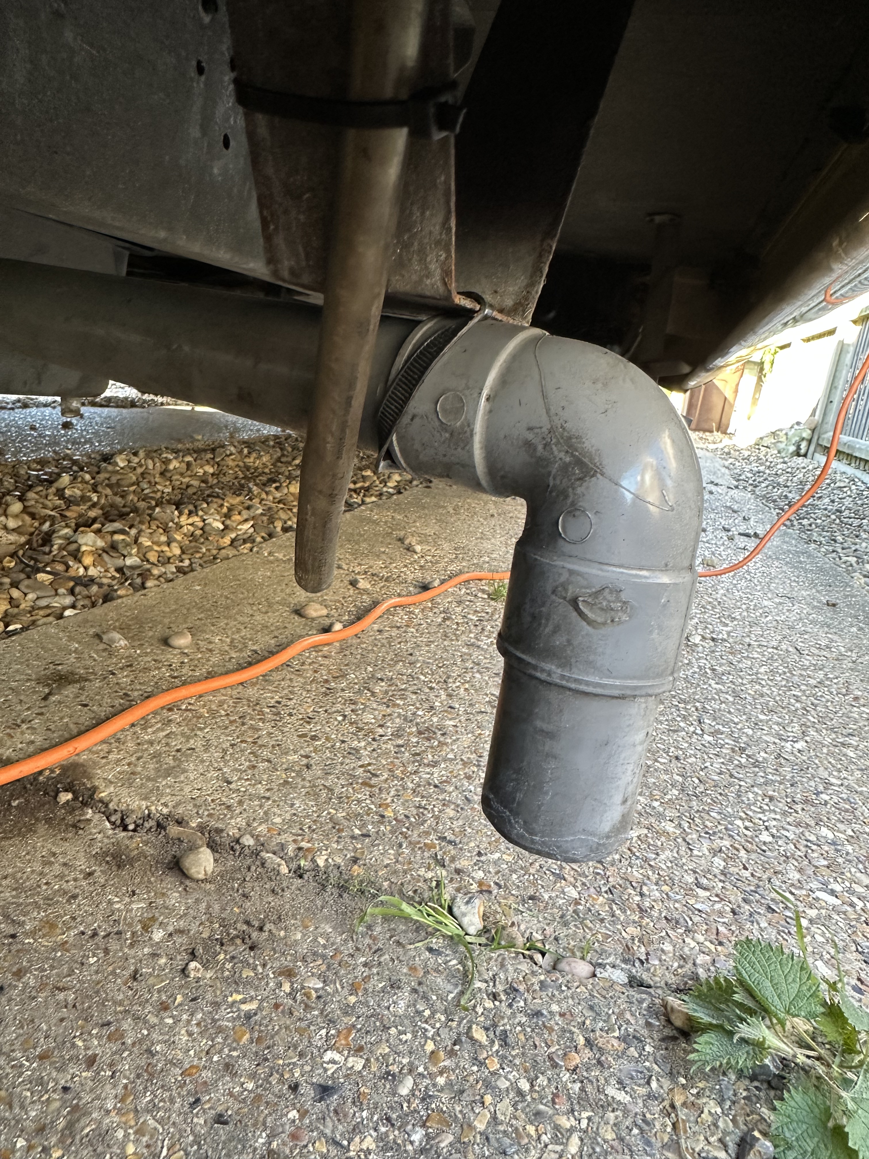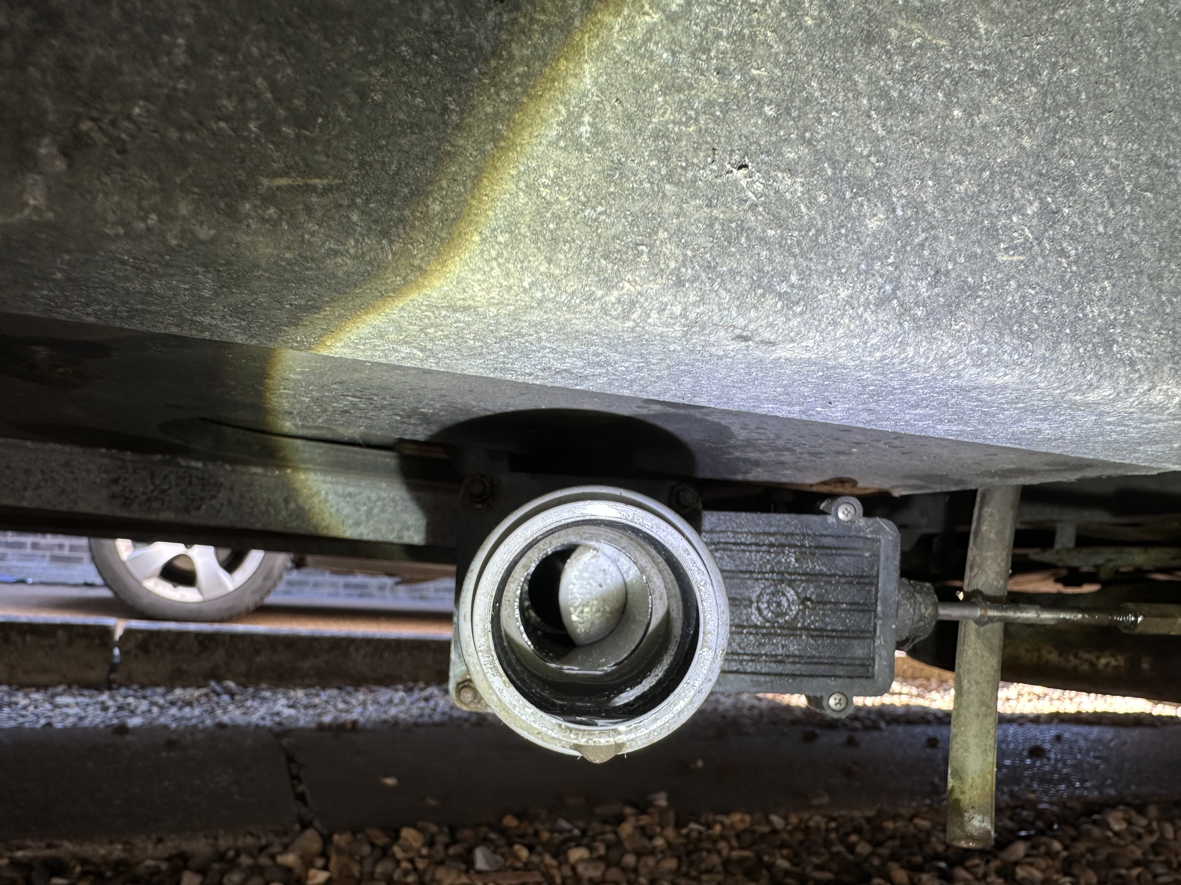 Ziggy’s grey waste tank is under the off side mid section – just forward of the entrance. There is a long metal pull rod to open the trap, and there is a grey piece of tube where – for those who remember, I made some connective pipework for serviced pitches if needed. First thing I noticed was there there appeared to be a protective case or cover over the tank, and I could not even see the actual tank or mechanism.