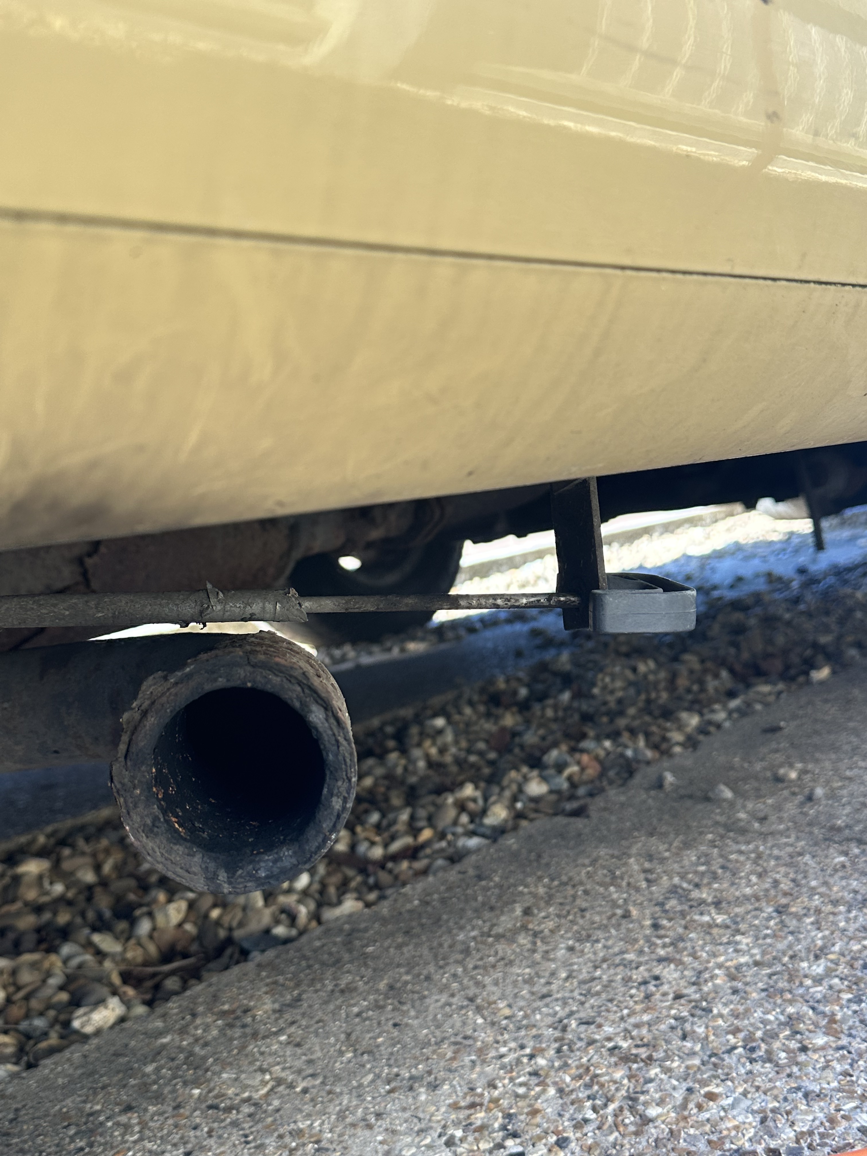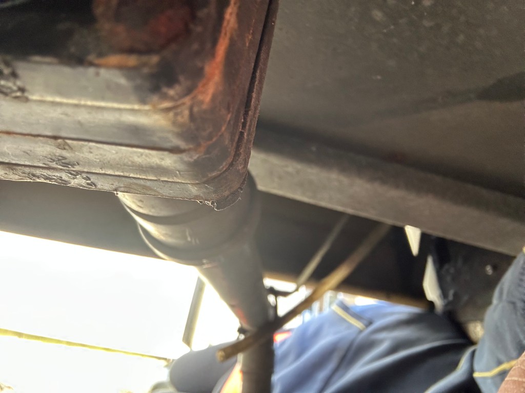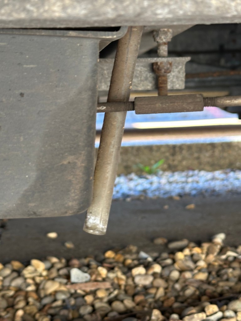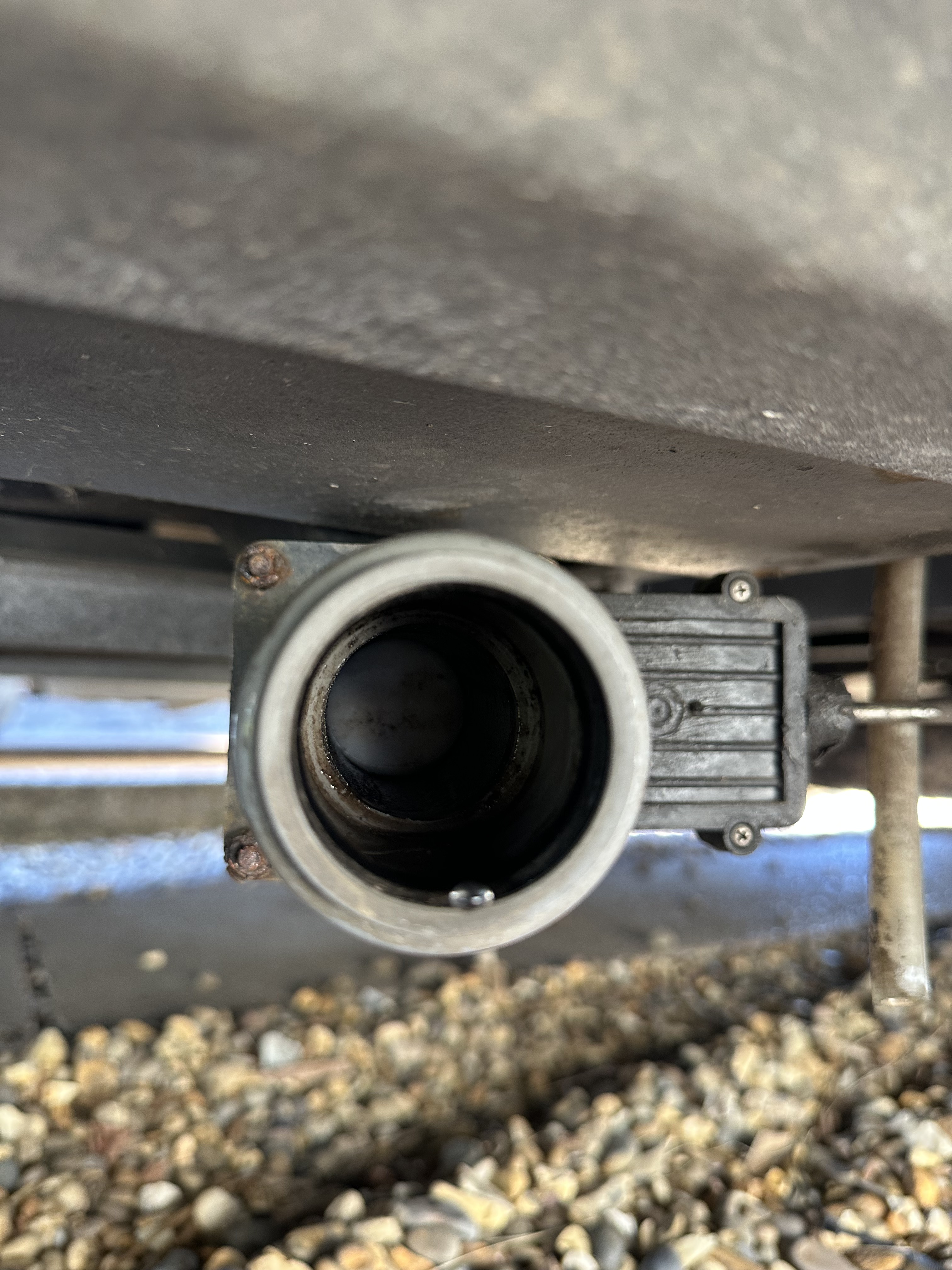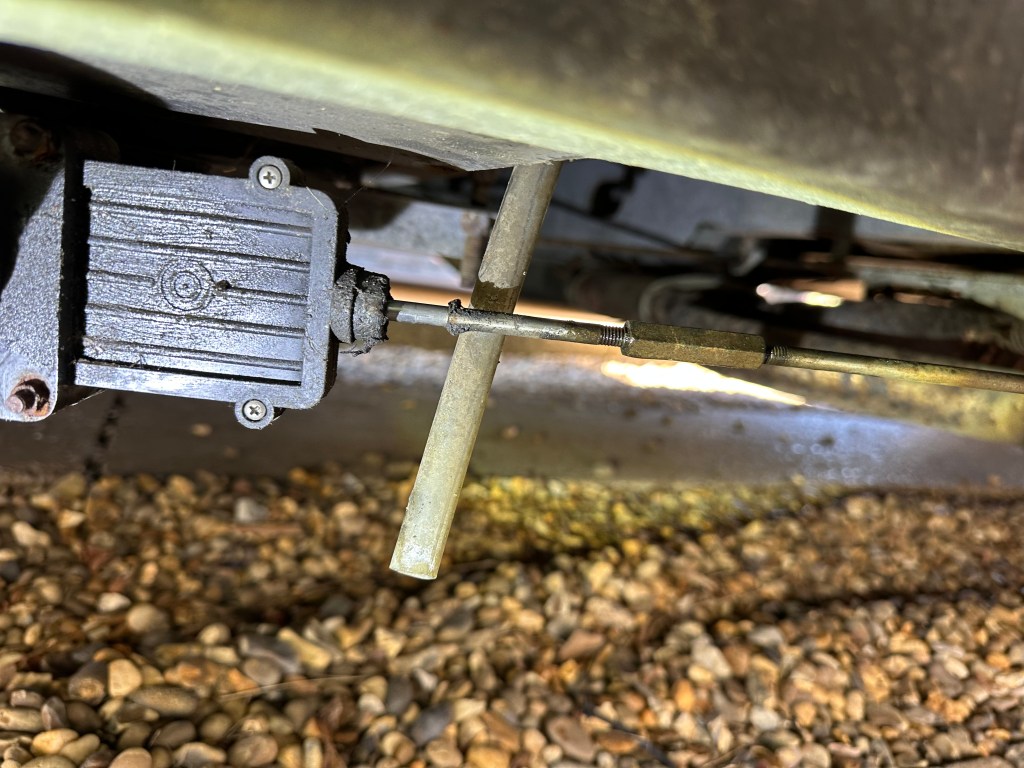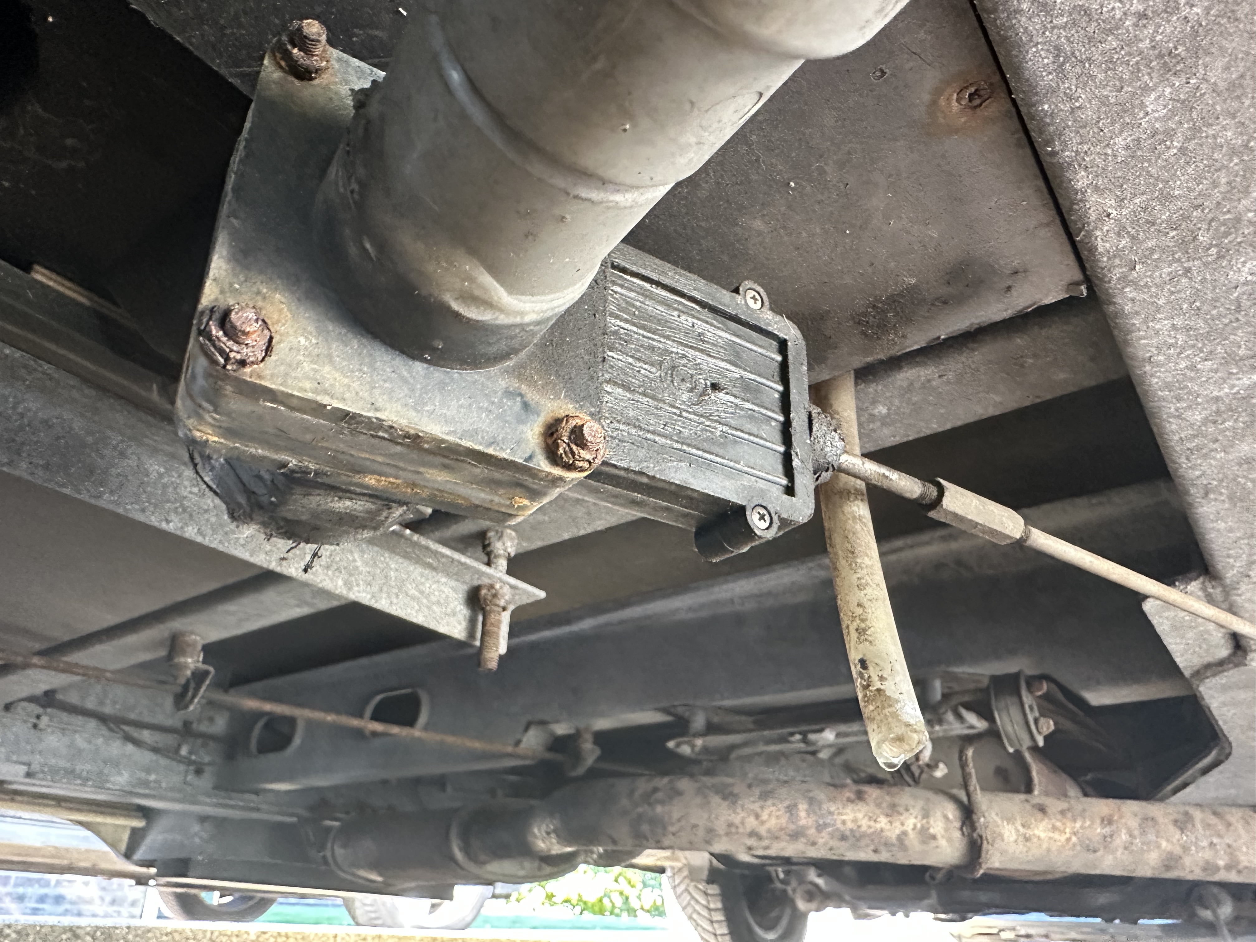 Ziggy’s grey waste tank is under the off side mid section – just forward of the entrance. There is a long metal pull rod to open the trap, and there is a grey piece of tube where – for those who remember, I made some connective pipework for serviced pitches if needed. First thing I noticed was there there appeared to be a protective case or cover over the tank, and I could not even see the actual tank or mechanism.