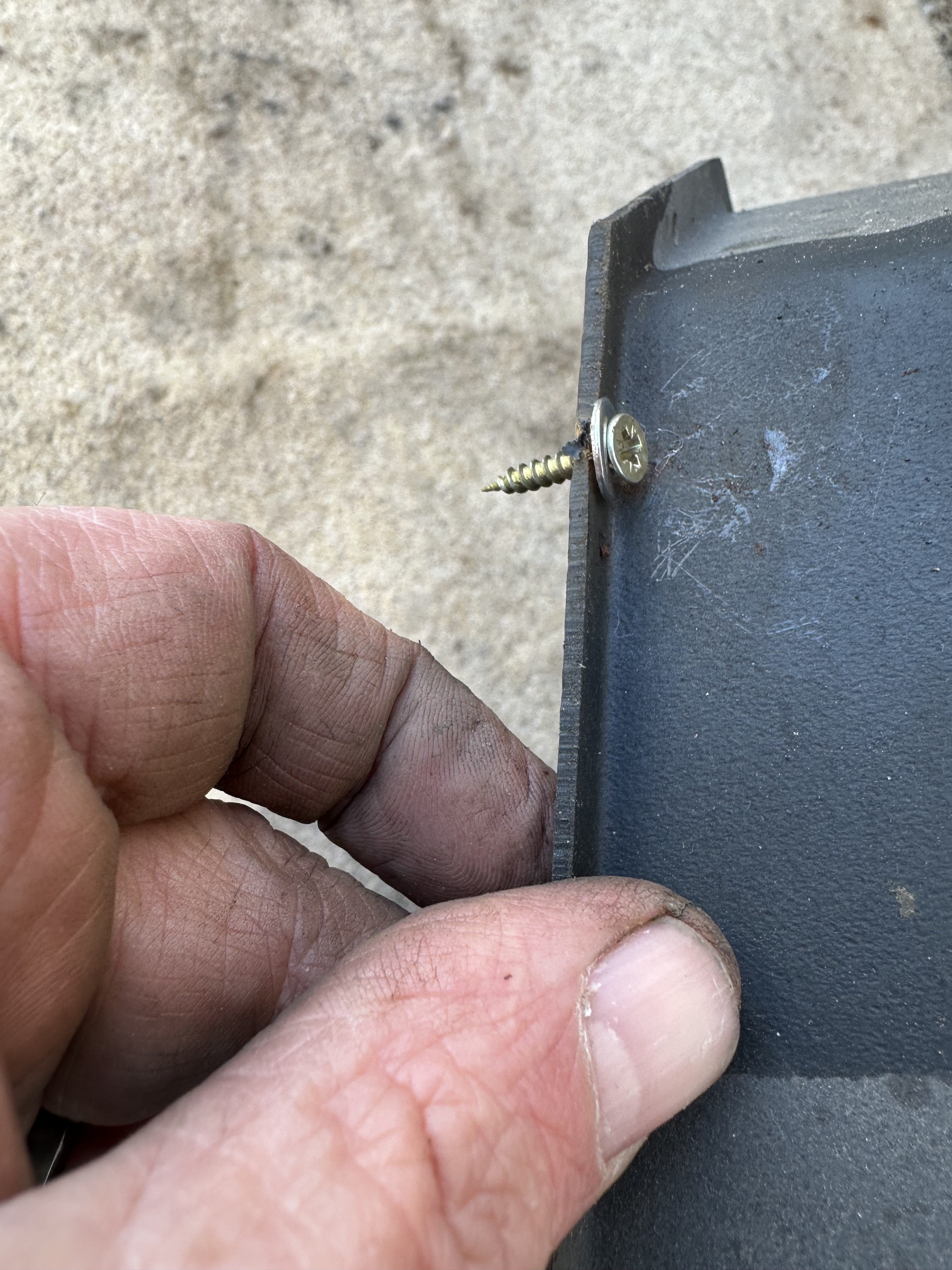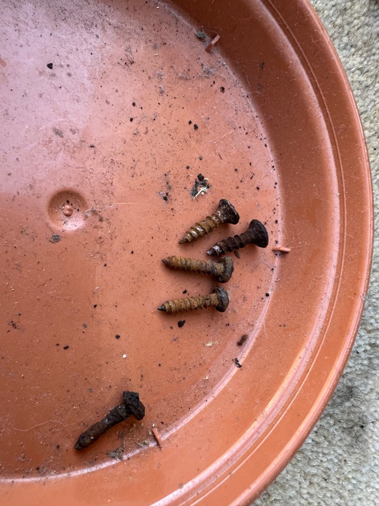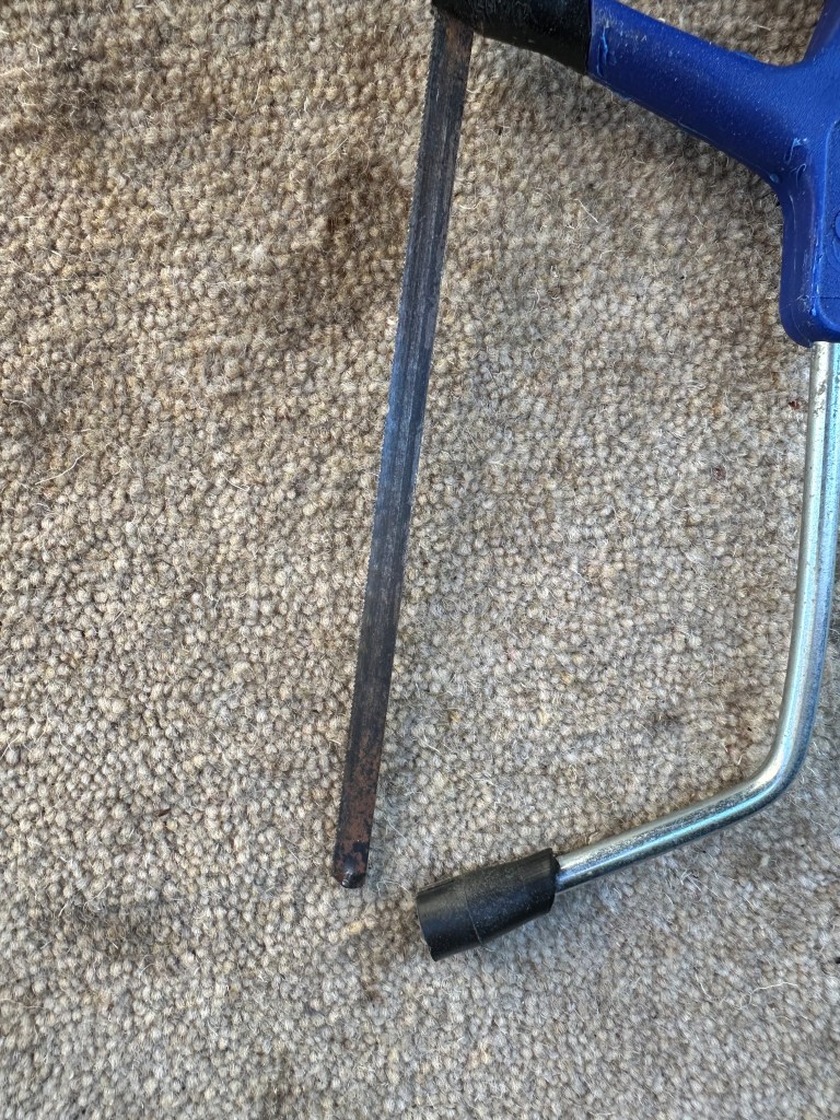 So – how to get round those issues – again, I returned to my Dad’s fund of knowledge and work rounds. The screw that was turning and now coming out – is actually very simple – in this instance, and sorry I do not have any spare arms to take a photo of this – I slid a flat blade screw drive under the plastic lip – and used that to apply leverage to start the screw head moving out – once I could see enough of it, I then was able to use a set of mole grips to under and pull out the screw. The second one was more of an issue, until I recalled how my old man had solved a similar problem. He took the blade out of a junior hack saw, and put that into the gap – I held the exposed blade with a work glove and cut the head off – I then used the mole grips to turn the corroded screw shaft out