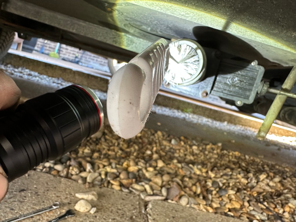 the cover was held in place with some small, self tapping screws and they were very badly corroded – I have shared and image of how badly – but one of them was merely turning with out removing, and one was so badly rusted, that the screw head would not turn – even with my impromptu impact driver; (My father was a mechanical engineer and had accumulated a lot of tools – and certain “adapted” tools as well – this is his cut down hammer for working in tight spaces – like underneath a motorhome!)