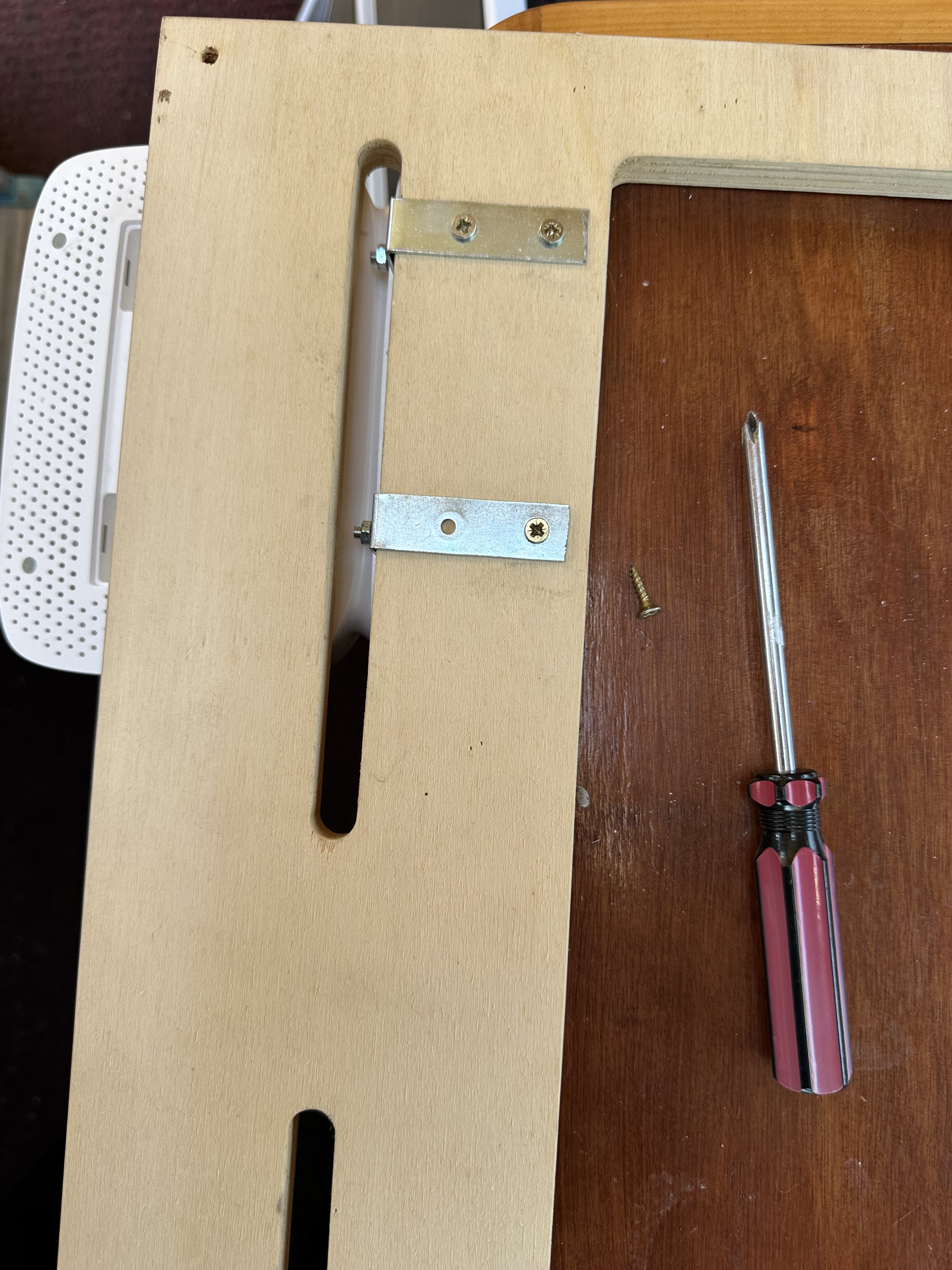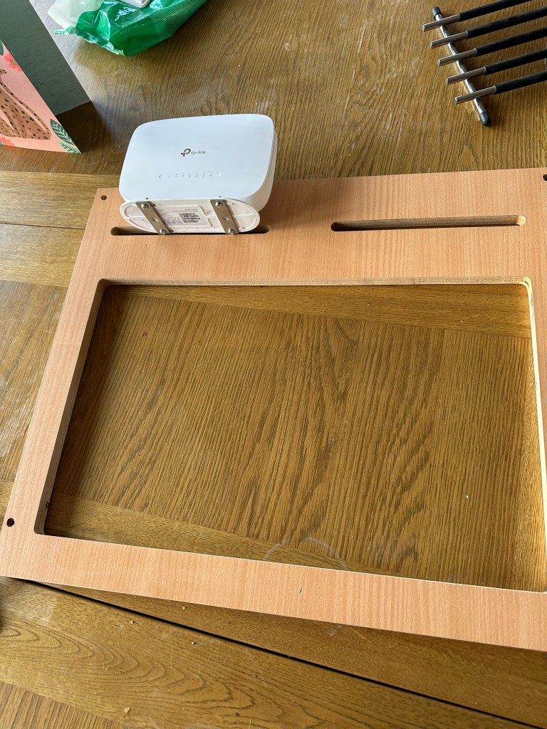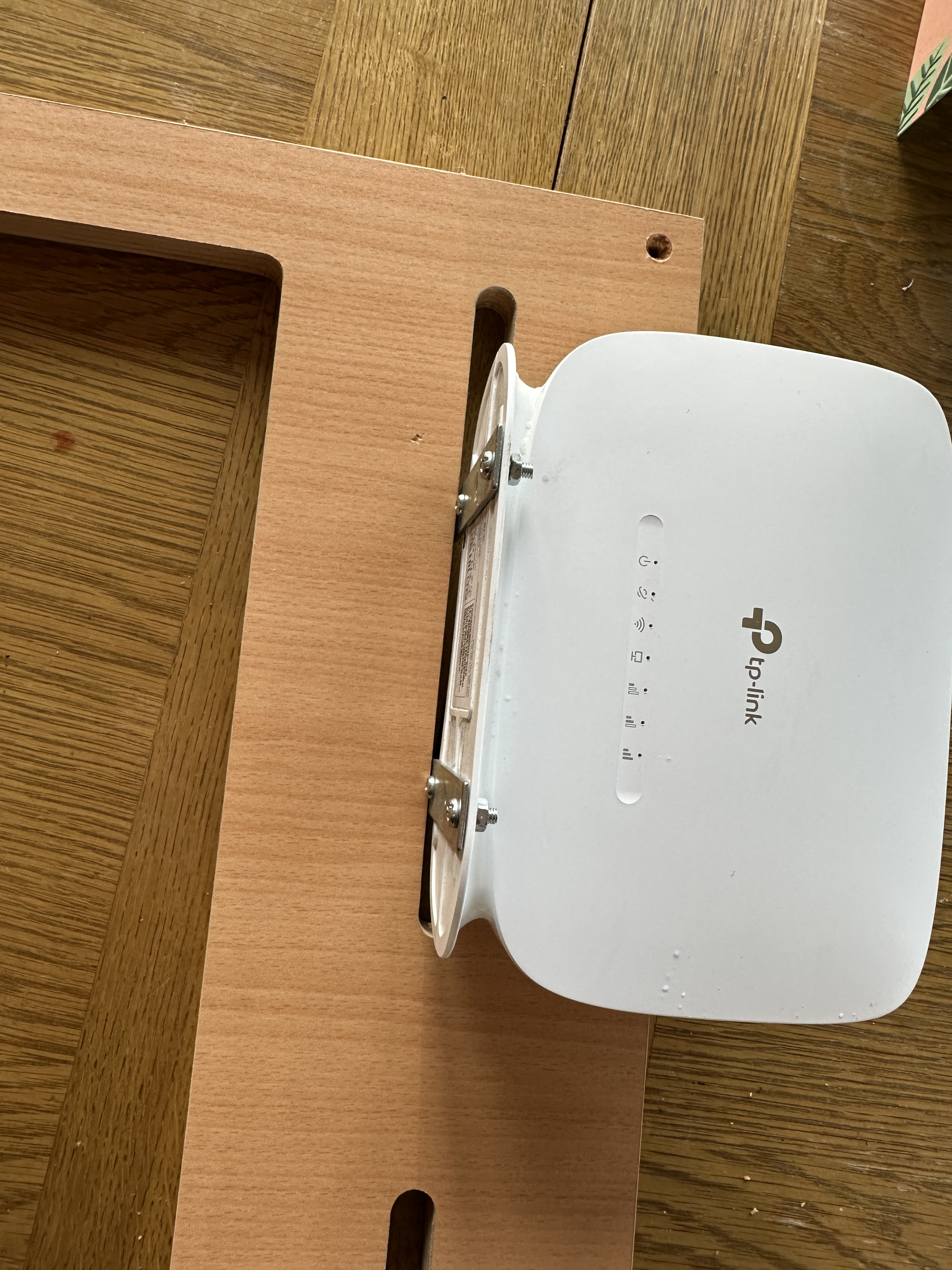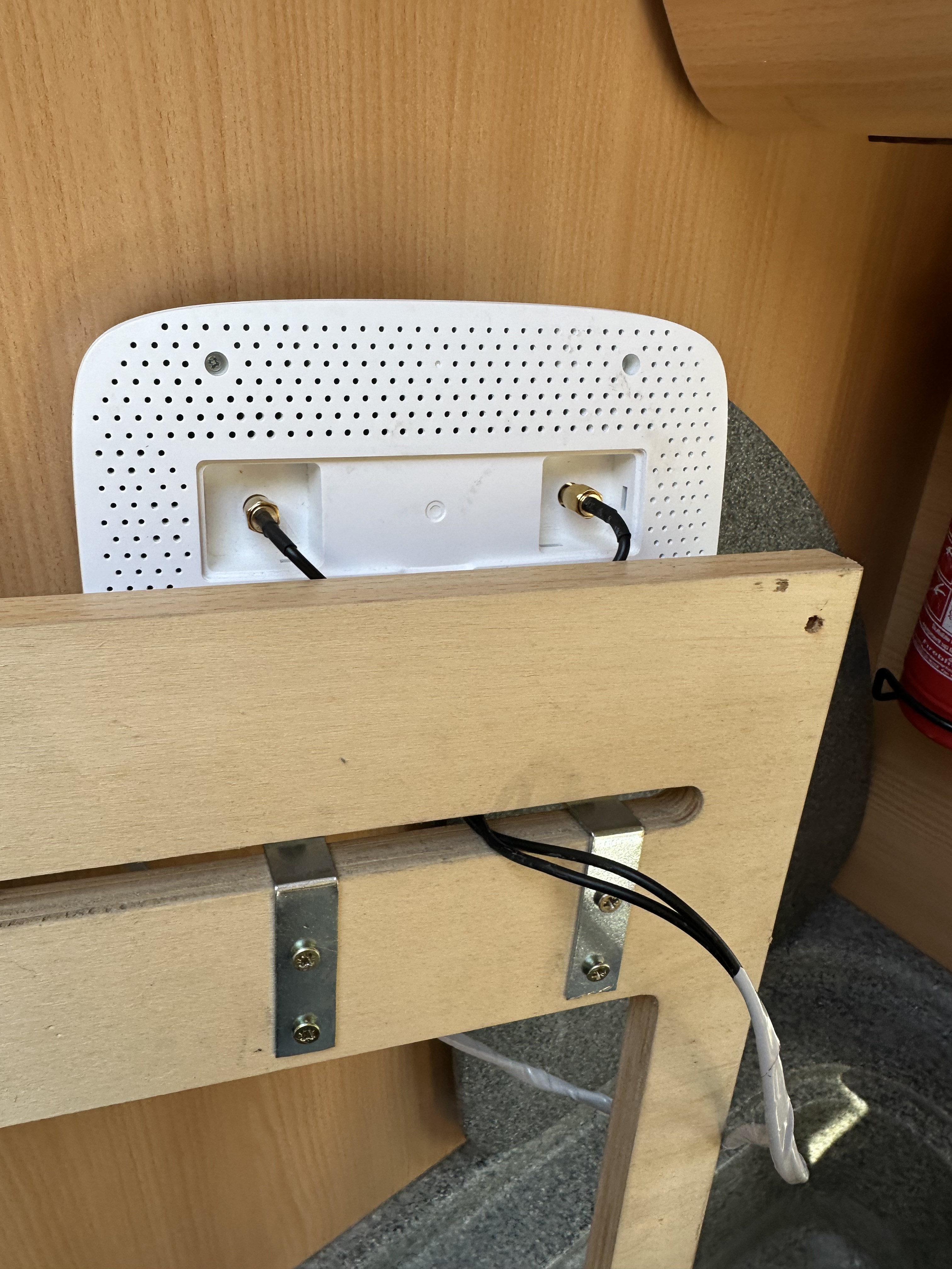 So, we now had the antenna mounted and cables led into the space above the microwave. There is a decorative surround that hides the retaining system for the microwave, and that is where i wanted to fit and mount the Mi-Fi router. I had some L brackets that – following a visit from Mr Hacksaw, the right size for the aperture and the router. I marked and drilled through the “foot” of the router and secured it in place with small nuts and bolts – note, I didn’t want to make a shelf that would have been aesthetically better – i wanted easy access to the sim slot for making swift sim swaps viable if needed in the future.