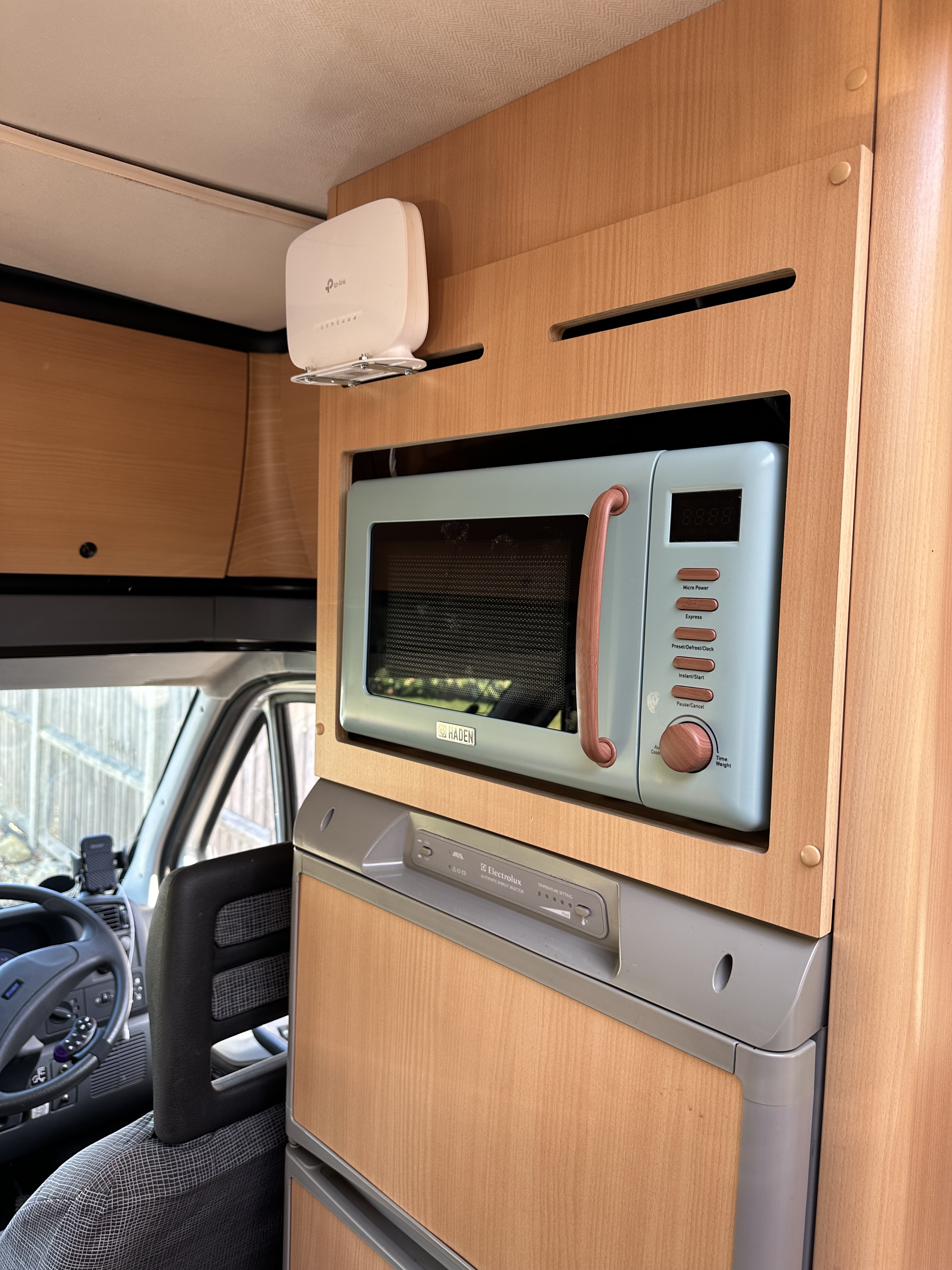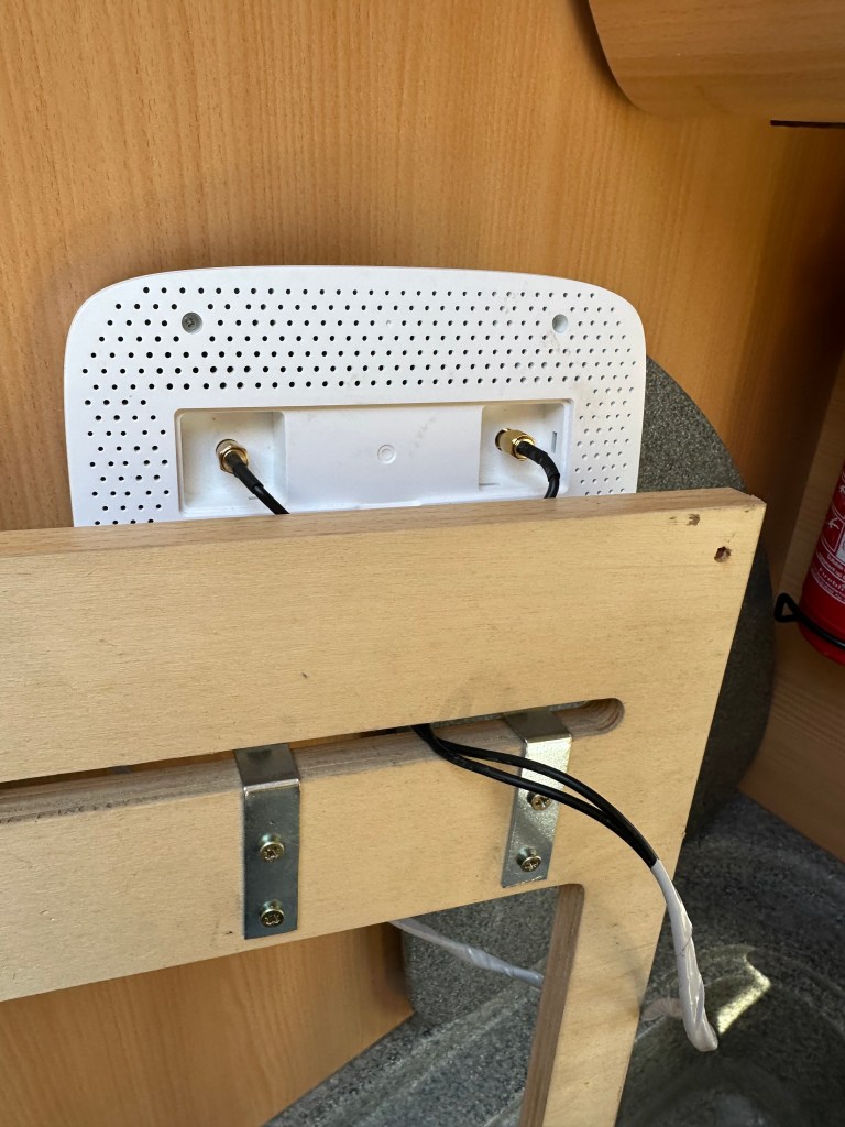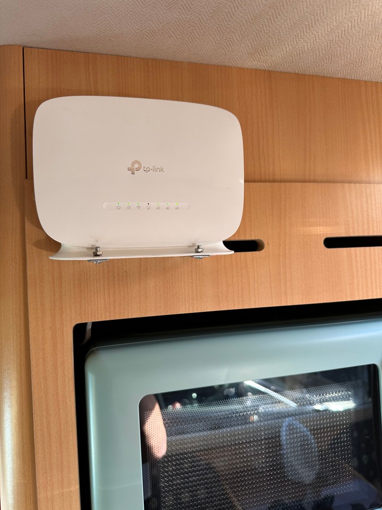 Behind the microwave was the 240v sockets, so power etc was all to hand. I then put the facade back on, powered up the TP Link Tether app, and set the details up – i then connected the TV and a slightly dodgy Firestick up to connect to the Mi-Fi. All good and getting speeds that were better than I expected. On our first Trip to Skegness – it will also be our last – we sat down and streamed a FHD movie from BBC iPlayer – in one evening we used 7.3gb data so – very worth while, and economic i think – I know Jo already has her iPad connected and she loves her YouTube channel… overall, a nice little fettle – its not obtrusive and has worked well.