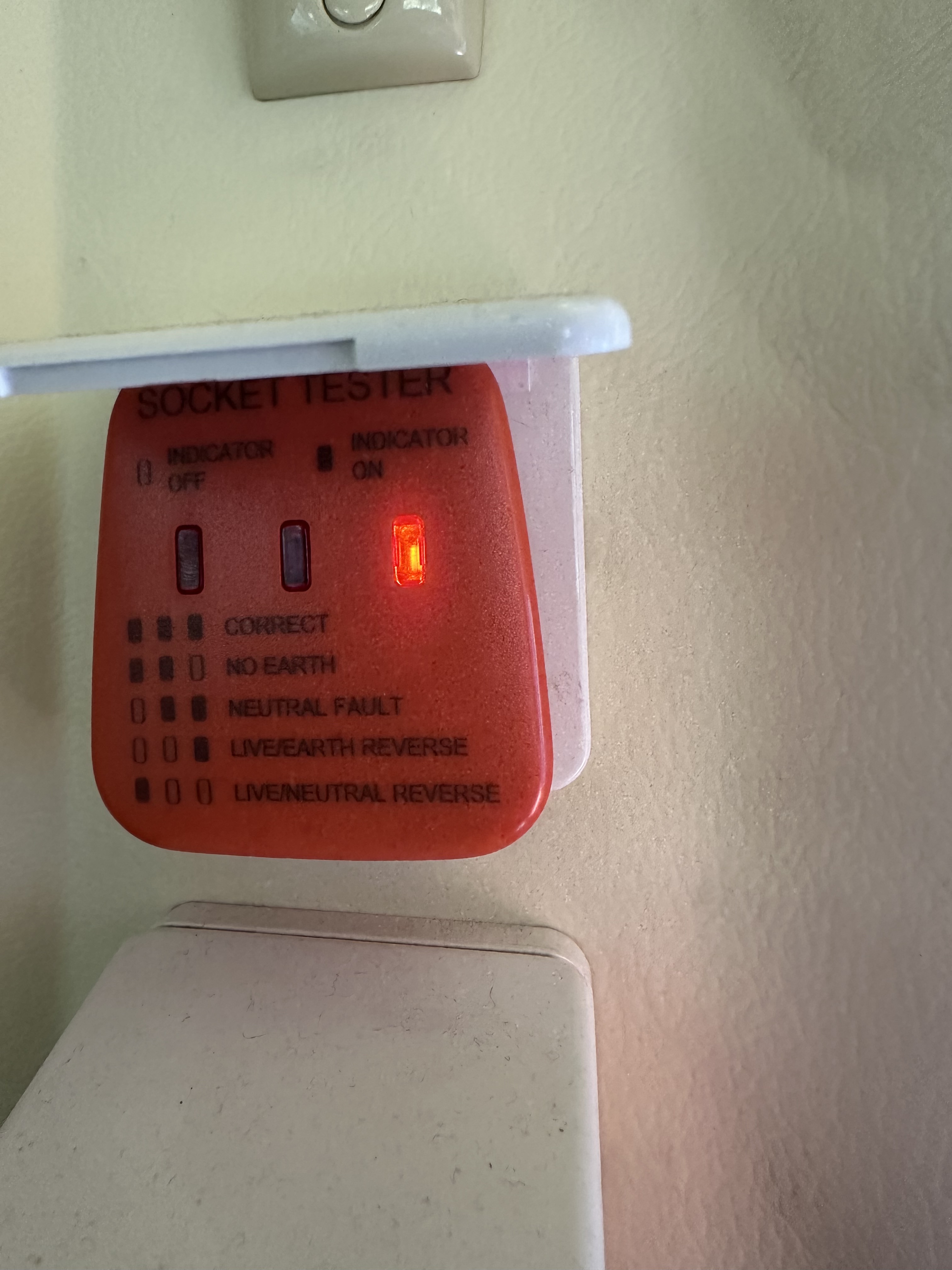 So, this showed that yes, indeed we had reverse polarity – now i did have an fly lead adapter with me, but, the first thing i did was to try a different socket. (Be aware that many camp sites do not use the UK standard plug for EHU – i I also travelled with a euro mains adapter) Now that particular mains block had 6 power outlets on it – and the next one i tried was fine – all three lights lit correctly – then i could turn on the fridge etc, and get the rest of the stuff unpacked and ready.