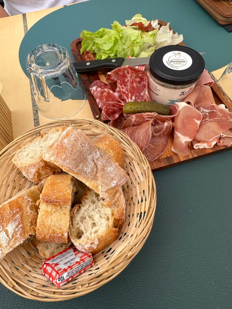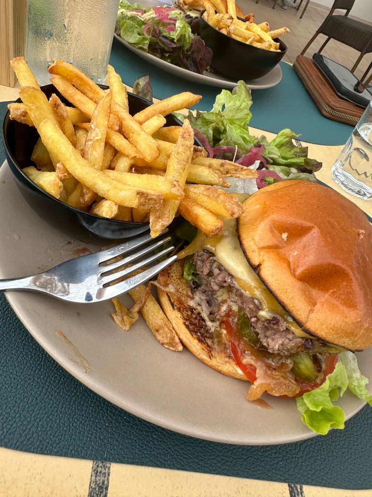 The restaurant here is busy, and has a great choice of foods. Madame and myself went for the Steak Hache burger on the first night – along with sharing a mixed meat platter – c’est tres Bon! for our last night Jo – at my insistence tried the Moules; I went for the Chicken Caesar. Madame was not a great fan of the moules, and being honest I did not enjoy the Chicken as it was a tad pink 😦