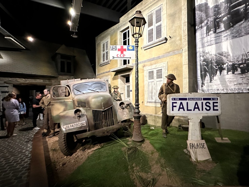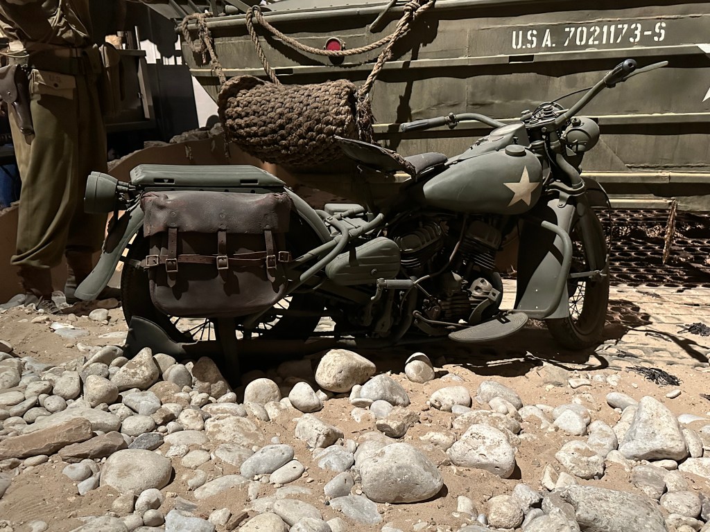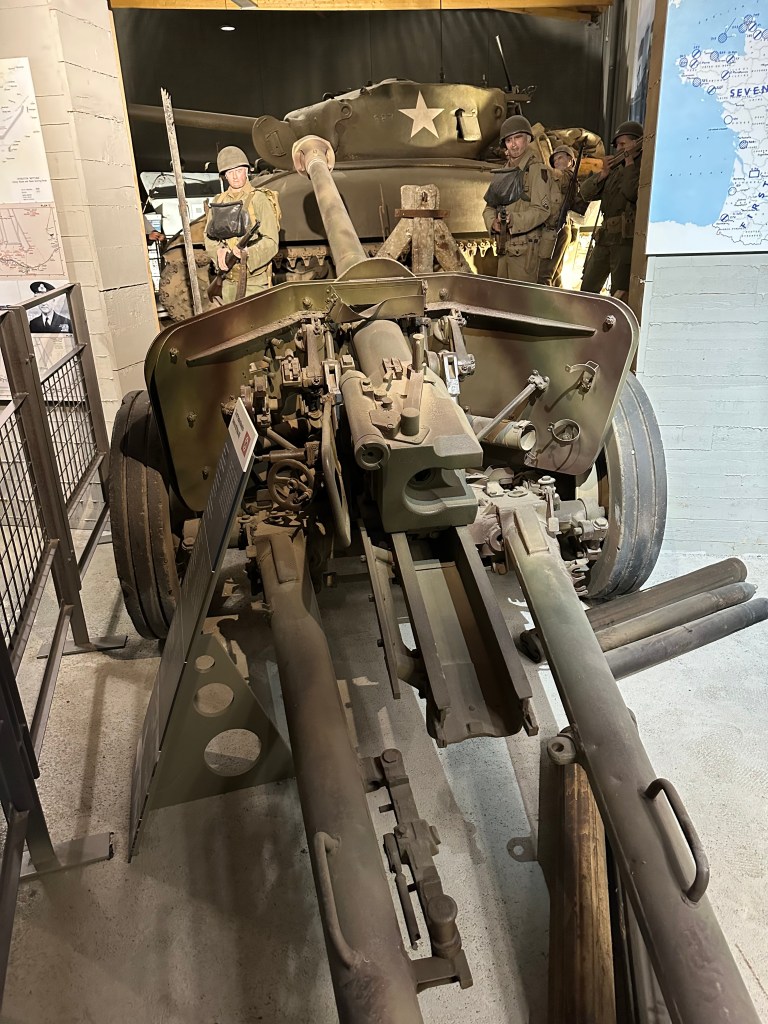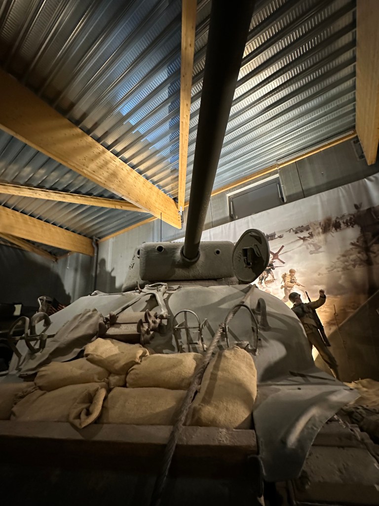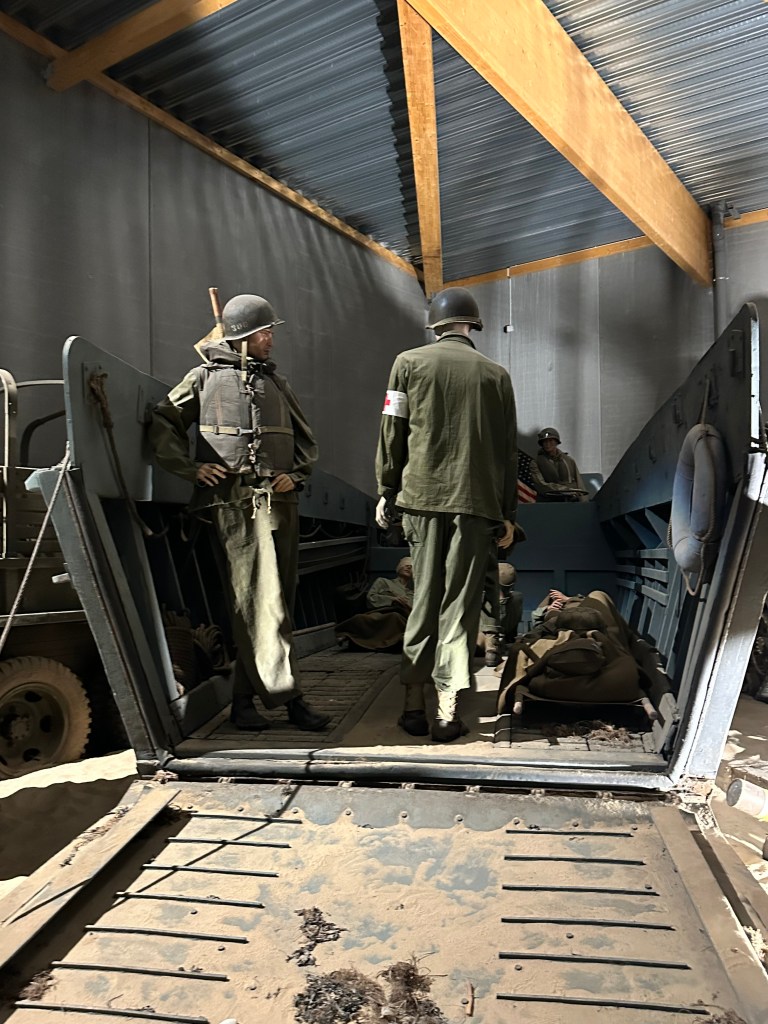 As we arrived at the museum, we saw a lot of signs for other museums and points of interest. The museum itself was a walk through, with much of the exhibits being presented in diorama form, which did bring things to life. The initial planning of D-Day was explained very well, and i did not realise that Eisenhower had pushed for more beaches – from four to five; i also did not realise how long it took all of the beaches to become a joined up beach head – six days! There was also a good explanation of life under the Third Reich – and the rise of the French Resistance . The early parts of the museum focused on the initial attacks – there was a collapsible boat that linked to the path finders who landed first, and there was an explanation of Pointe du Hoc which I was not even aware of.