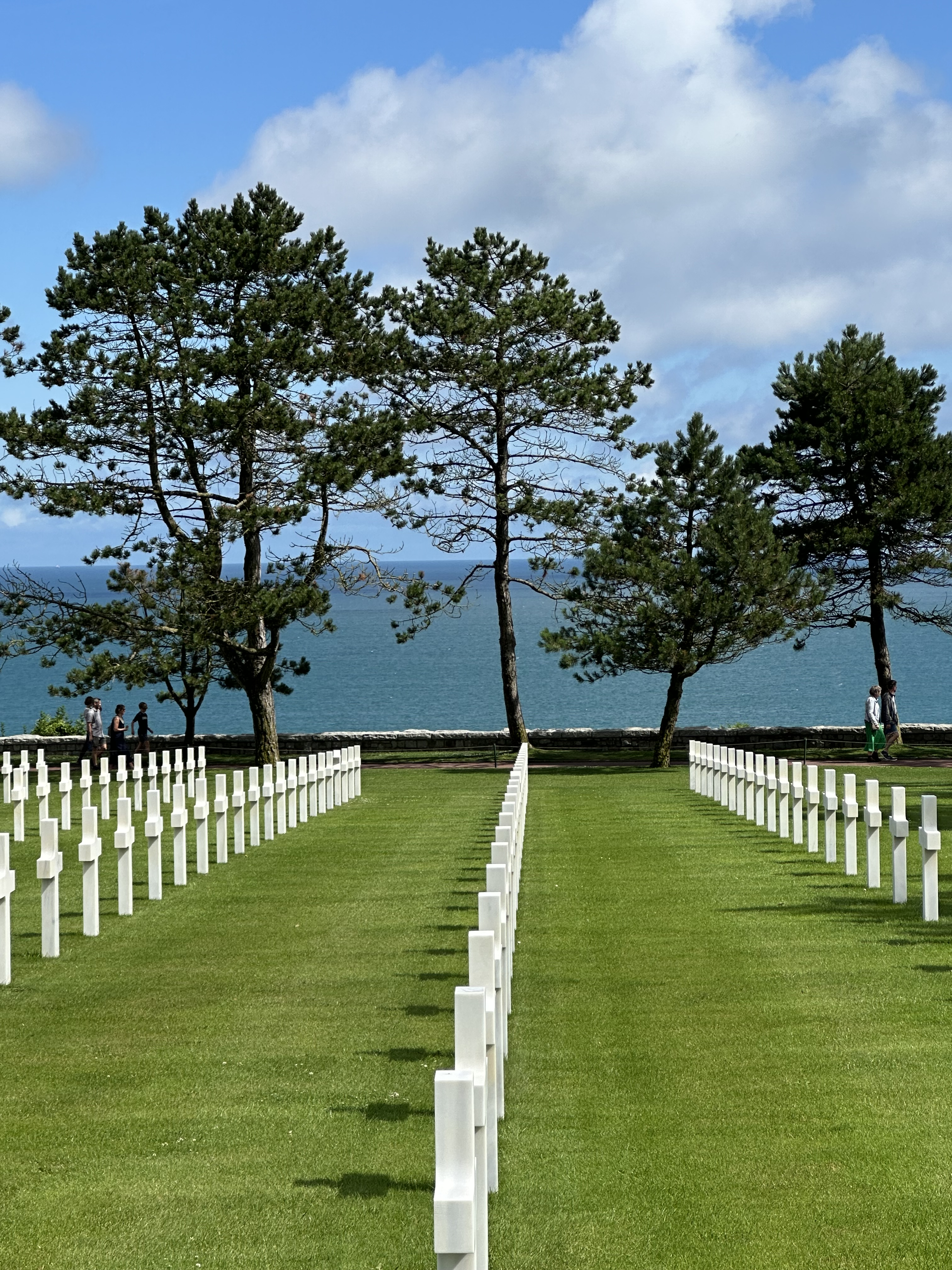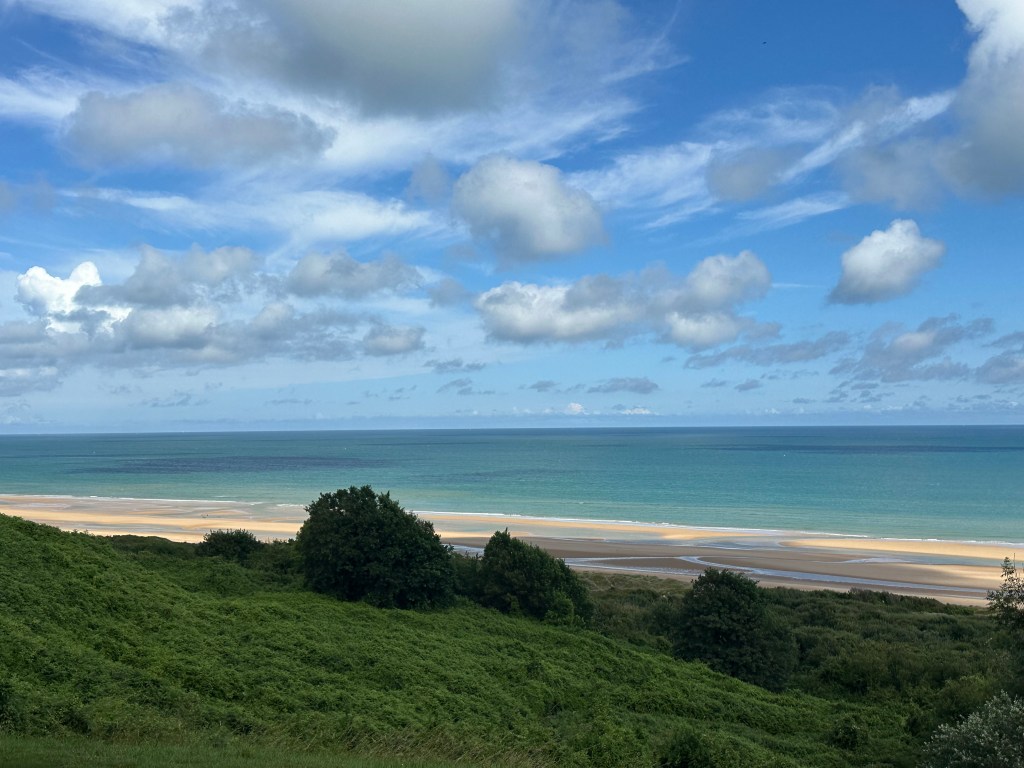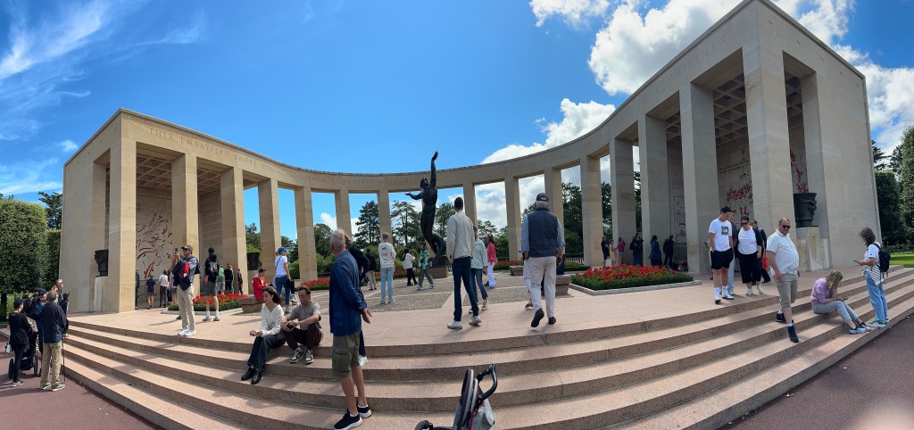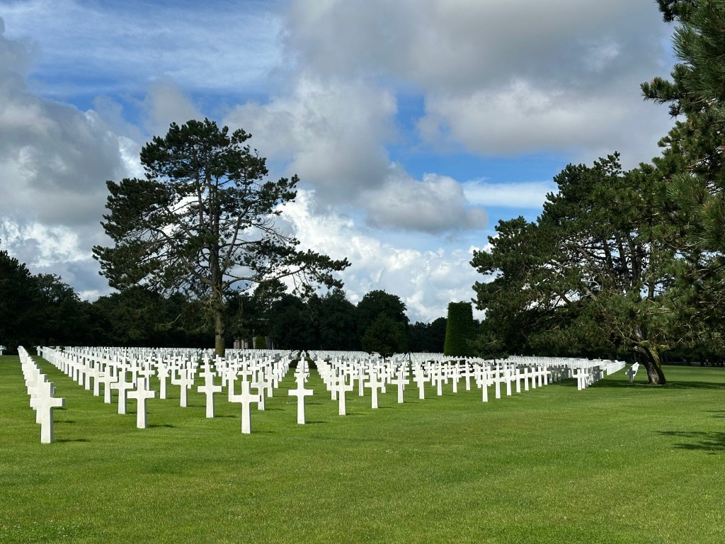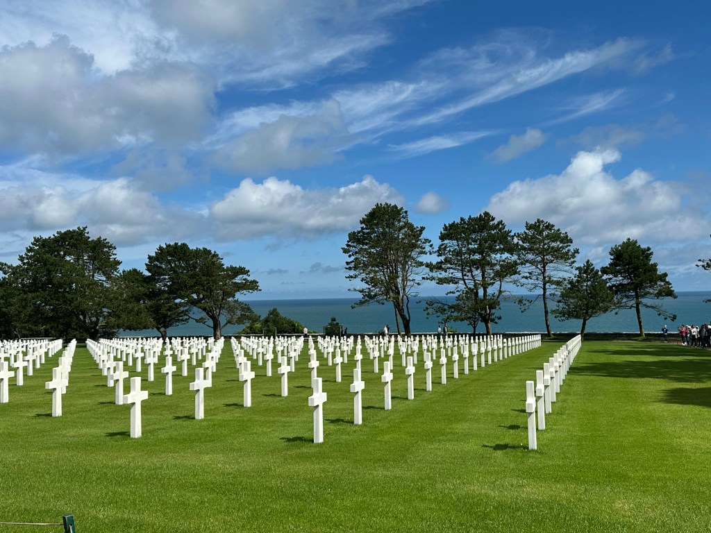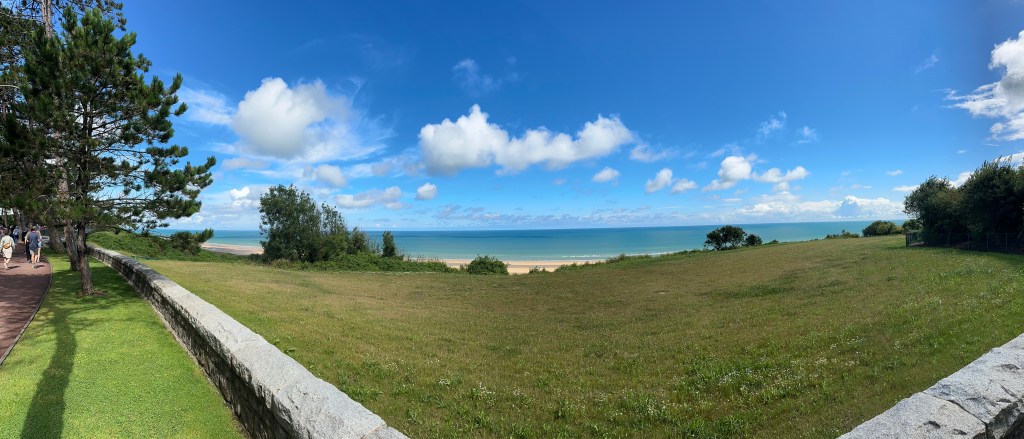 After a fascinating hour or so, we came towards the end of the museum and came to a corridor of photographs – people who had landed on D-Day and then come back to visit the area – the photograps were of these men from June 1944 – and then when they returned. Several of the photo frames had French Tricolour ribbons that revealed when they had passed away. It was to poignant to photograph – and seemed that these old boys had lost their youth in that battle. we left the museum and drove a few kilometers towards the sea for Omaha Beach and the American Military Cemetery.