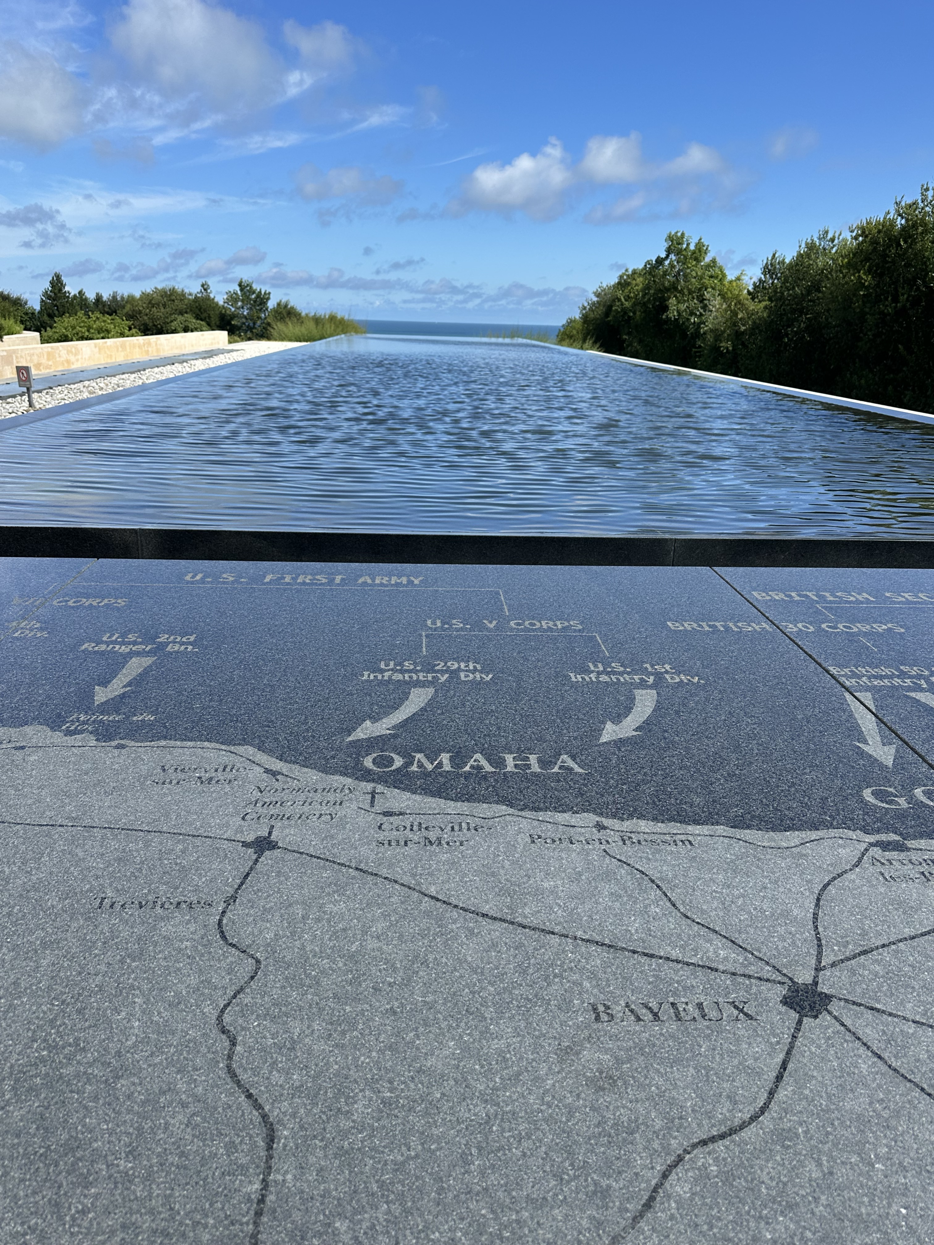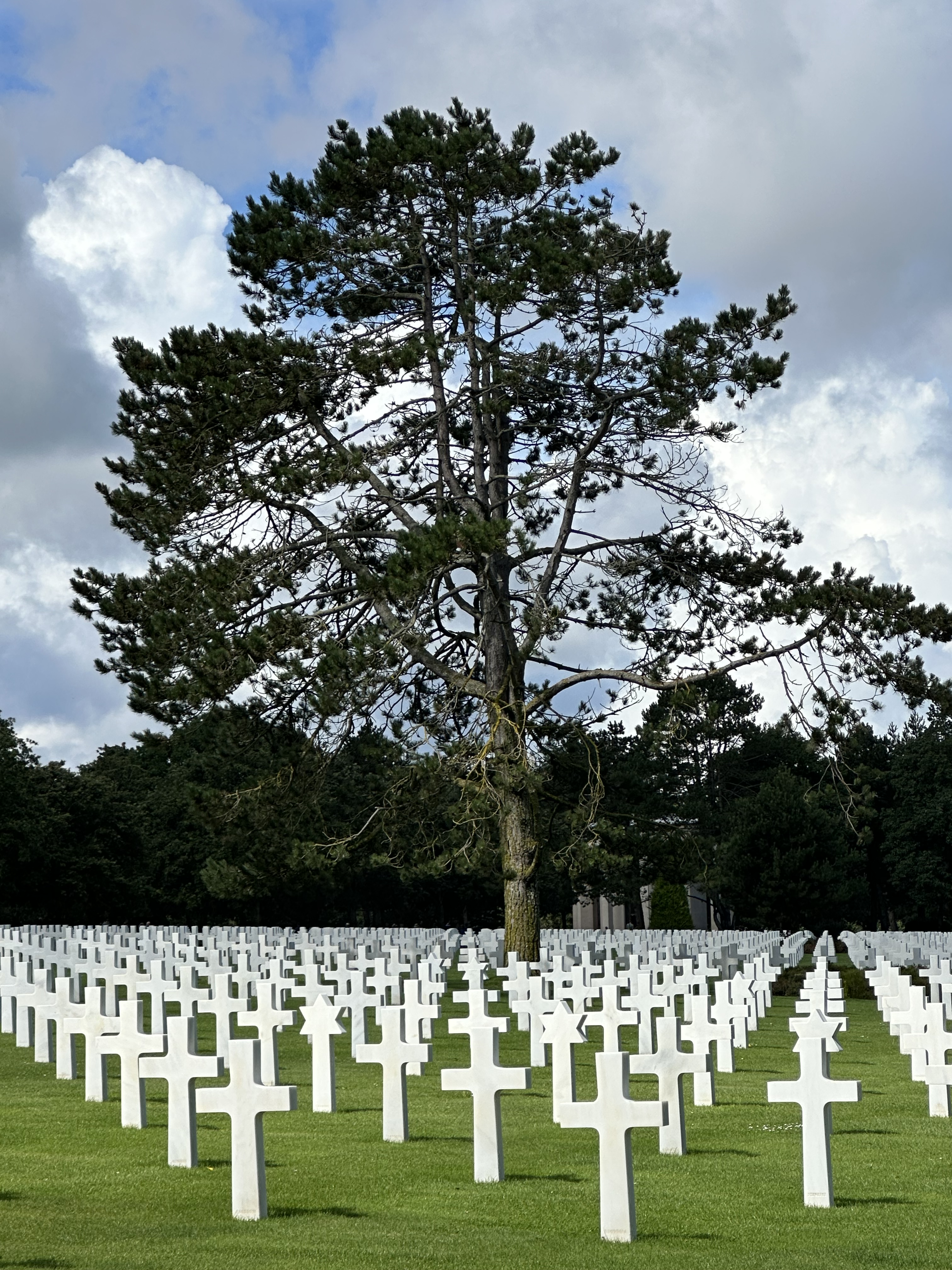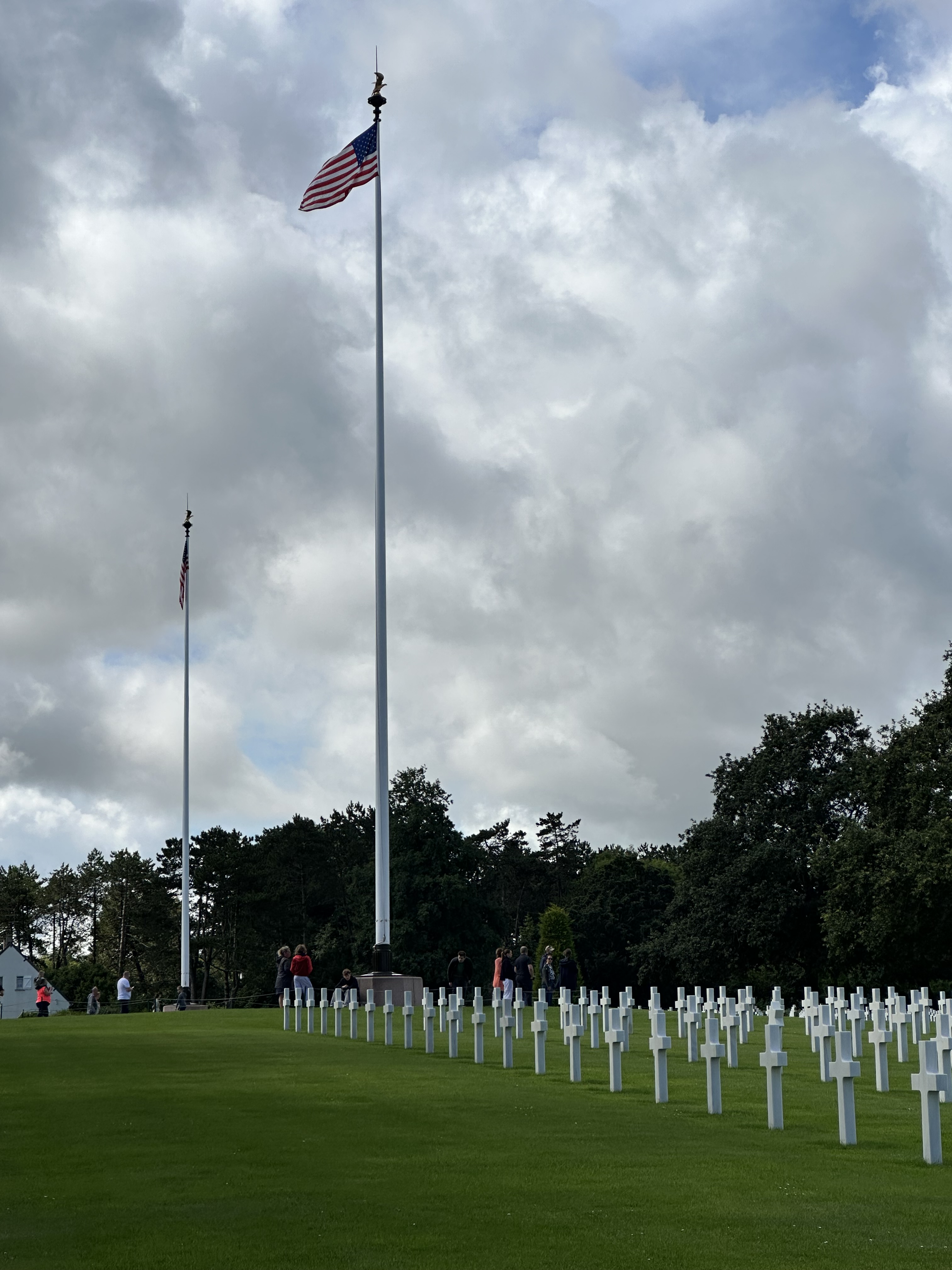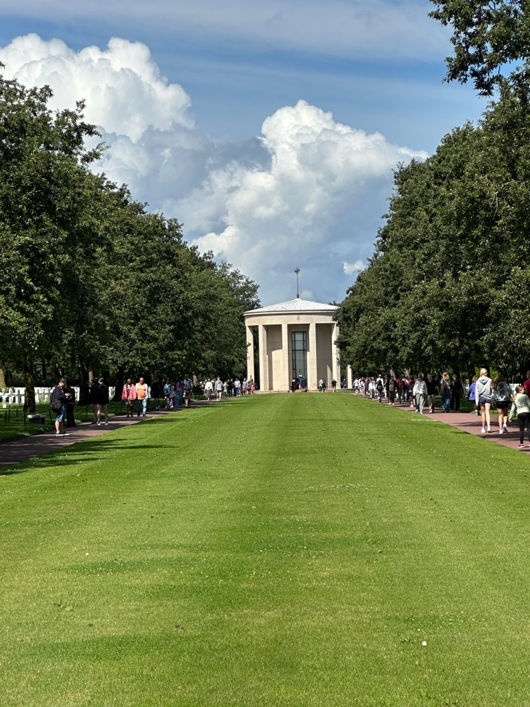 After a fascinating hour or so, we came towards the end of the museum and came to a corridor of photographs – people who had landed on D-Day and then come back to visit the area – the photograps were of these men from June 1944 – and then when they returned. Several of the photo frames had French Tricolour ribbons that revealed when they had passed away. It was to poignant to photograph – and seemed that these old boys had lost their youth in that battle. we left the museum and drove a few kilometers towards the sea for Omaha Beach and the American Military Cemetery.