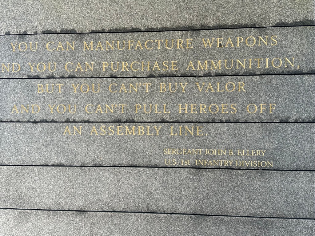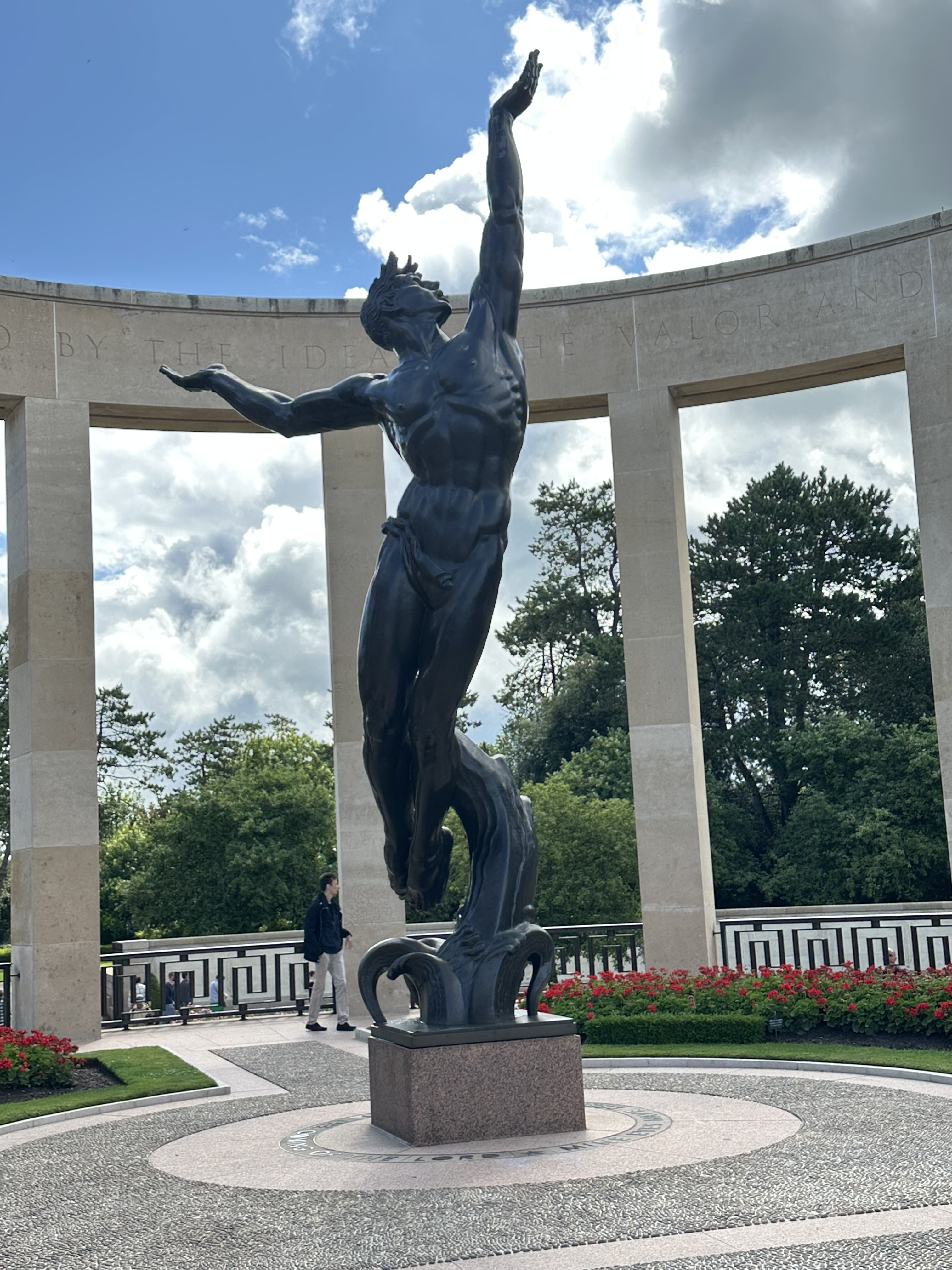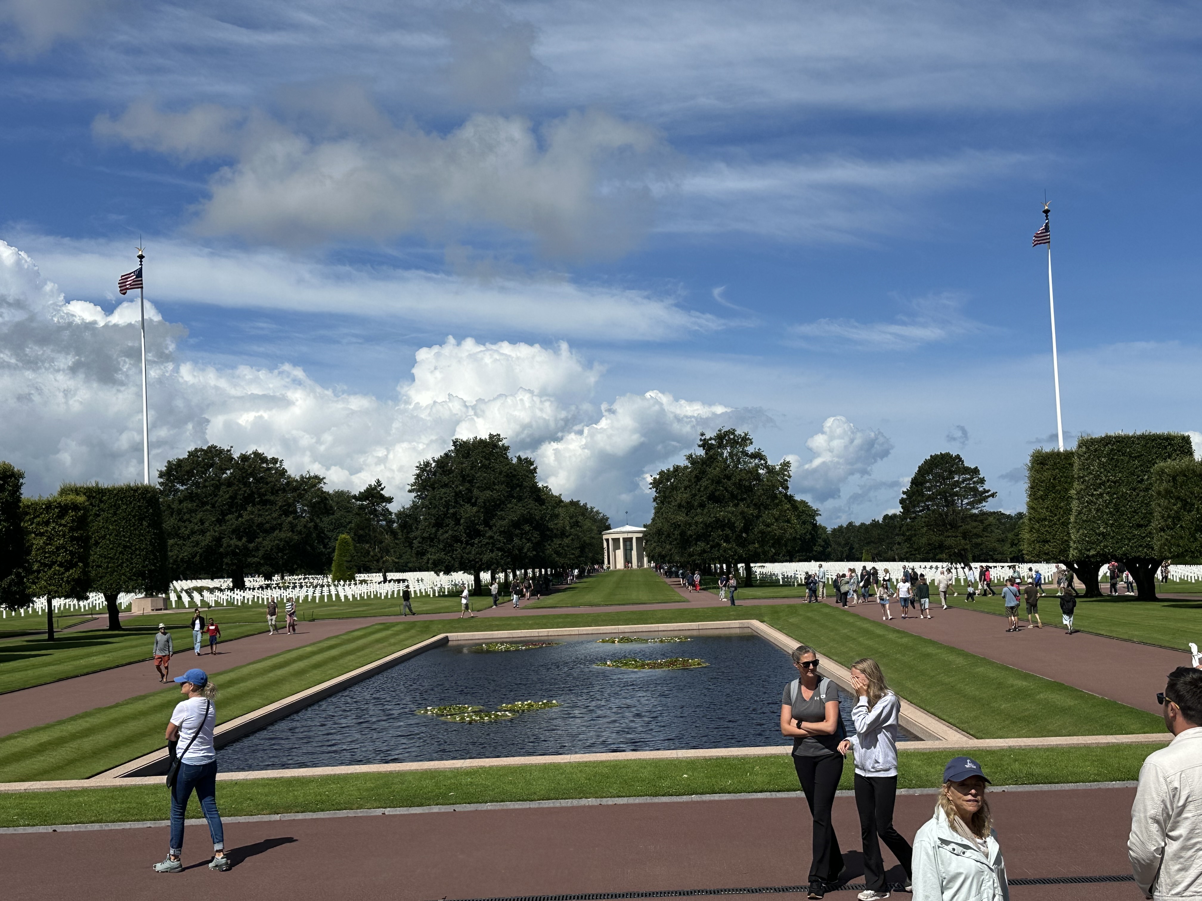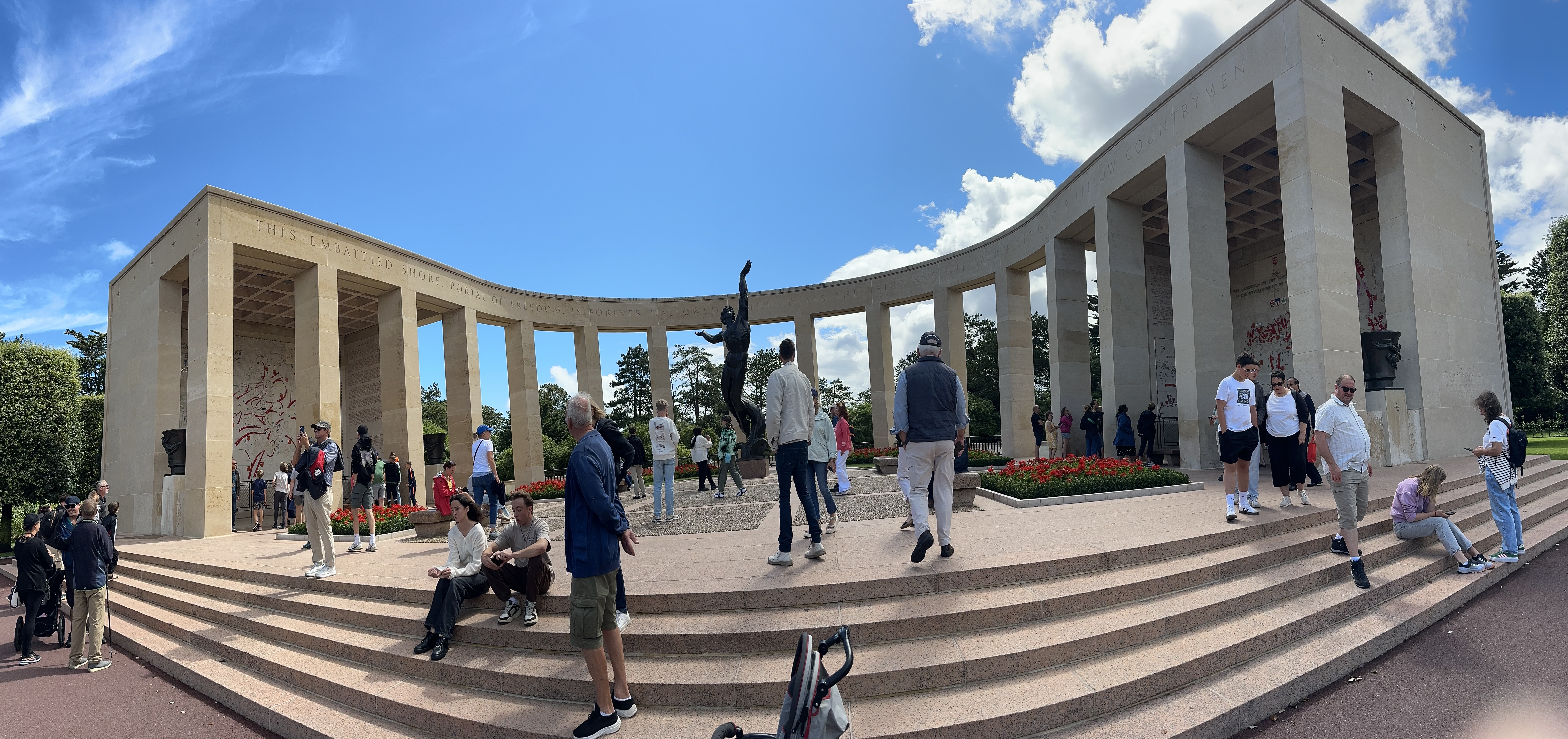After a fascinating hour or so, we came towards the end of the museum and came to a corridor of photographs – people who had landed on D-Day and then come back to visit the area – the photograps were of these men from June 1944 – and then when they returned. Several of the photo frames had French Tricolour ribbons that revealed when they had passed away. It was to poignant to photograph – and seemed that these old boys had lost their youth in that battle. we left the museum and drove a few kilometers towards the sea for Omaha Beach and the American Military Cemetery.
