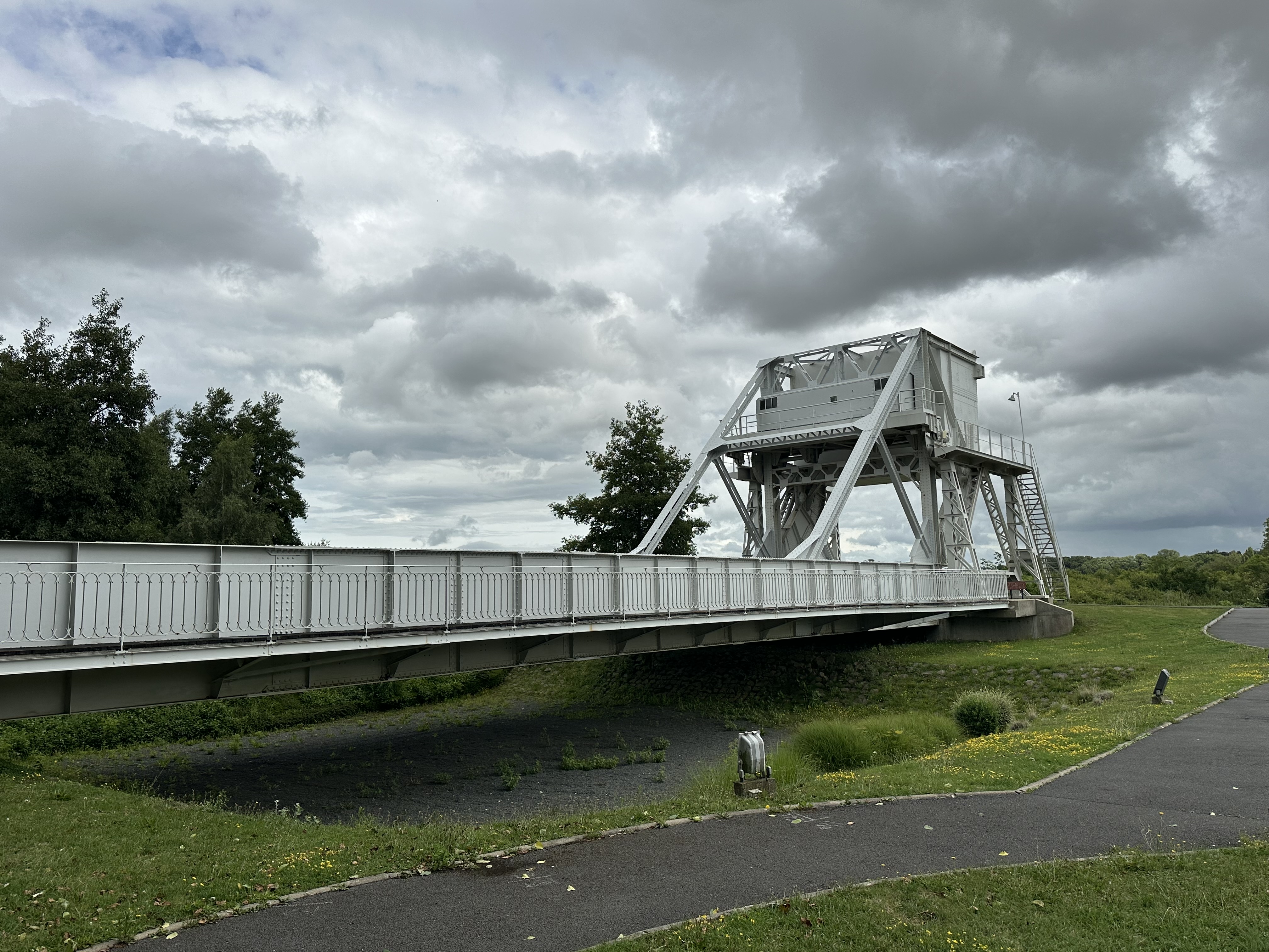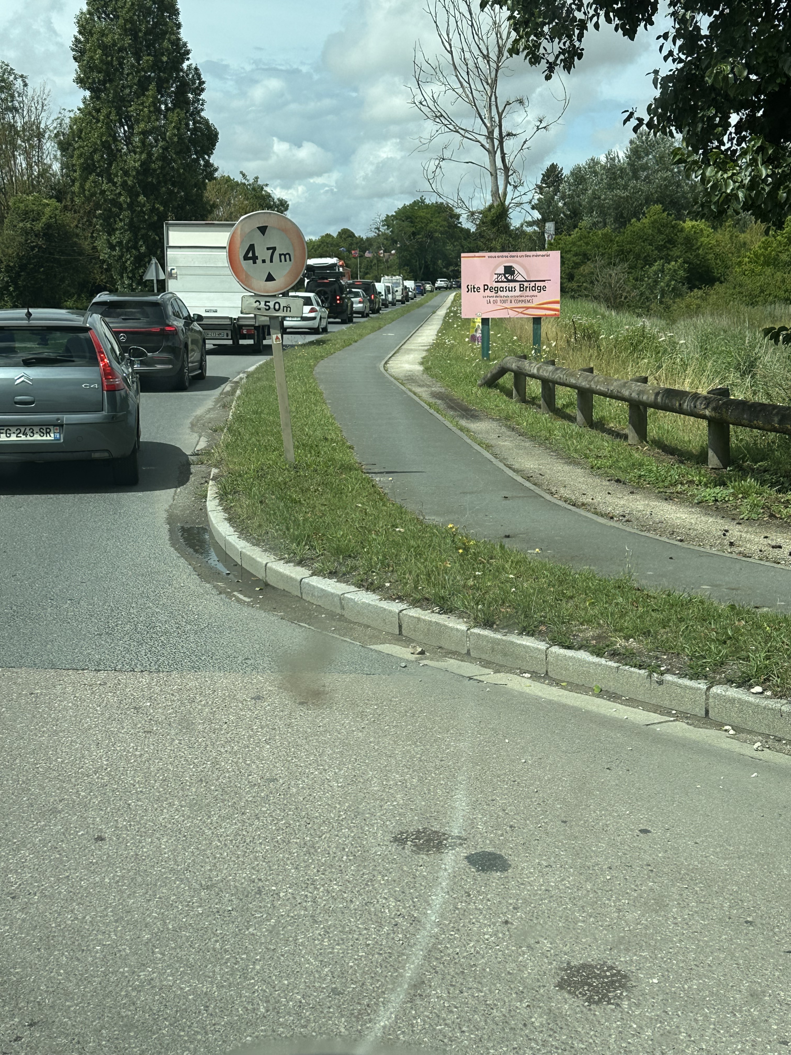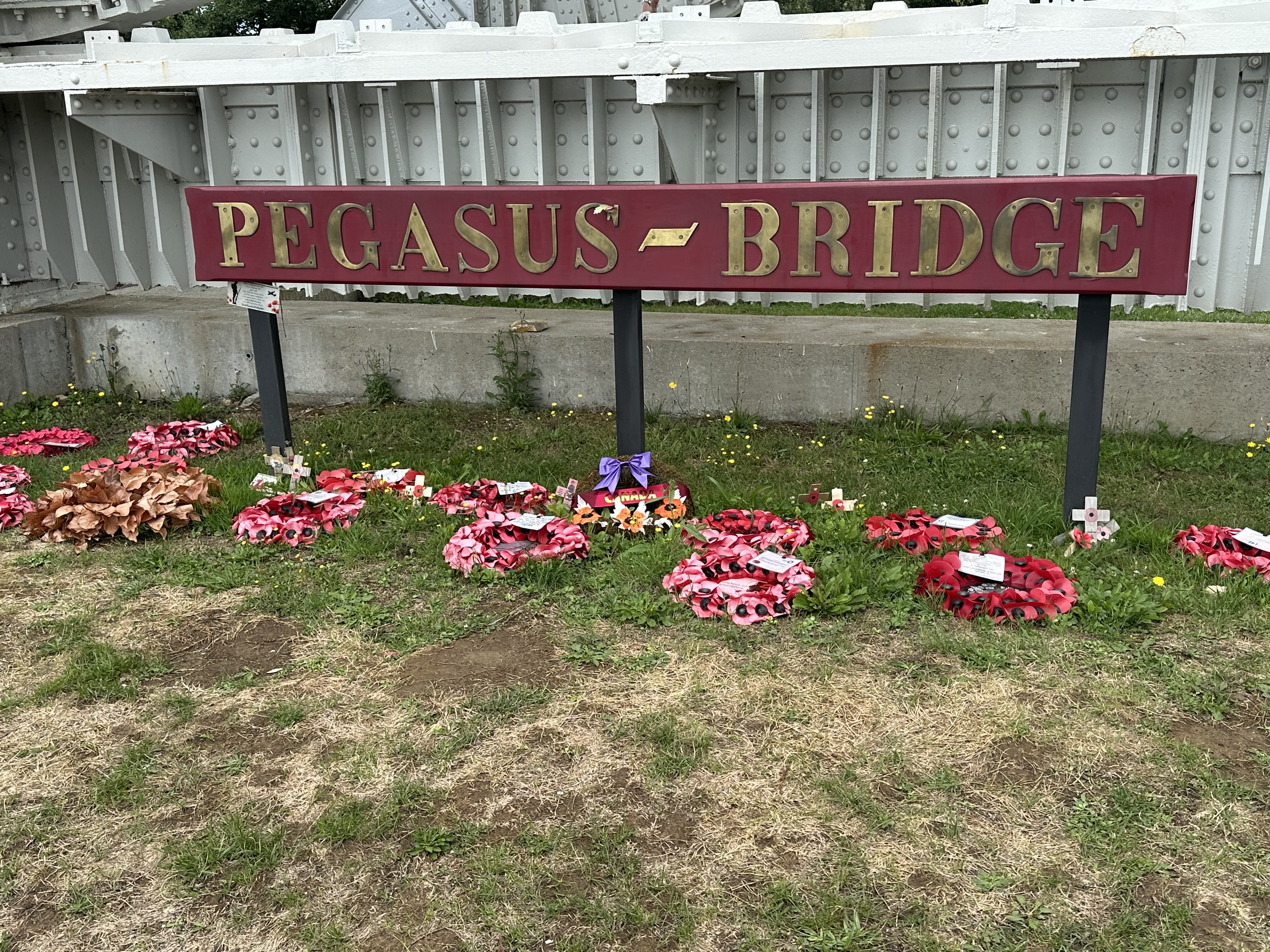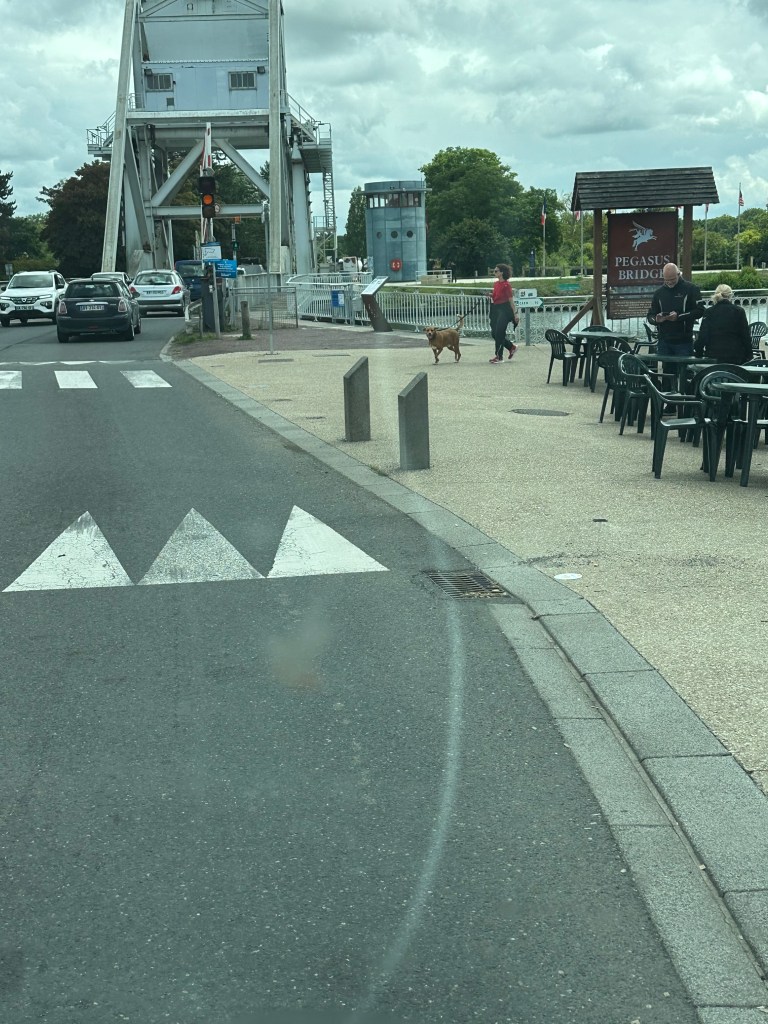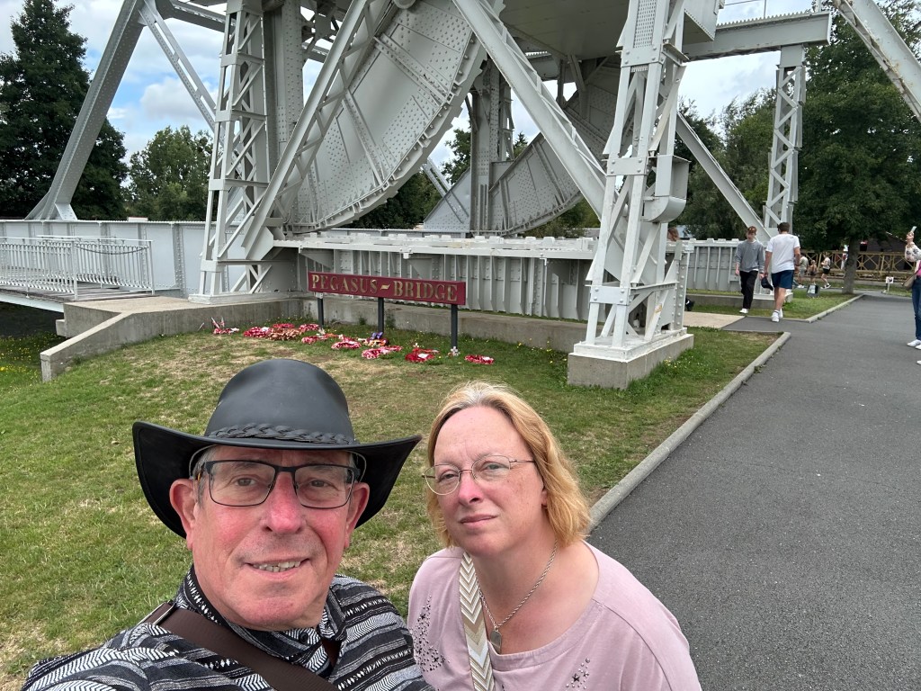 We had met a lovely couple at Moulin de Campech who had highly recommended the Pagasus Bridge Museum that is close to what was formerly called Benouville Bridge but is now known as Pegasus Bridge as a memorial to its capture by members of the British Airborne (Glider troops) – they wore an emblem of Pegasus – the winged horse as their shoulder flash on their uniforms. The road trip from Omaha Beach was only some 40 miles, travelling around the outskirts of Caen.