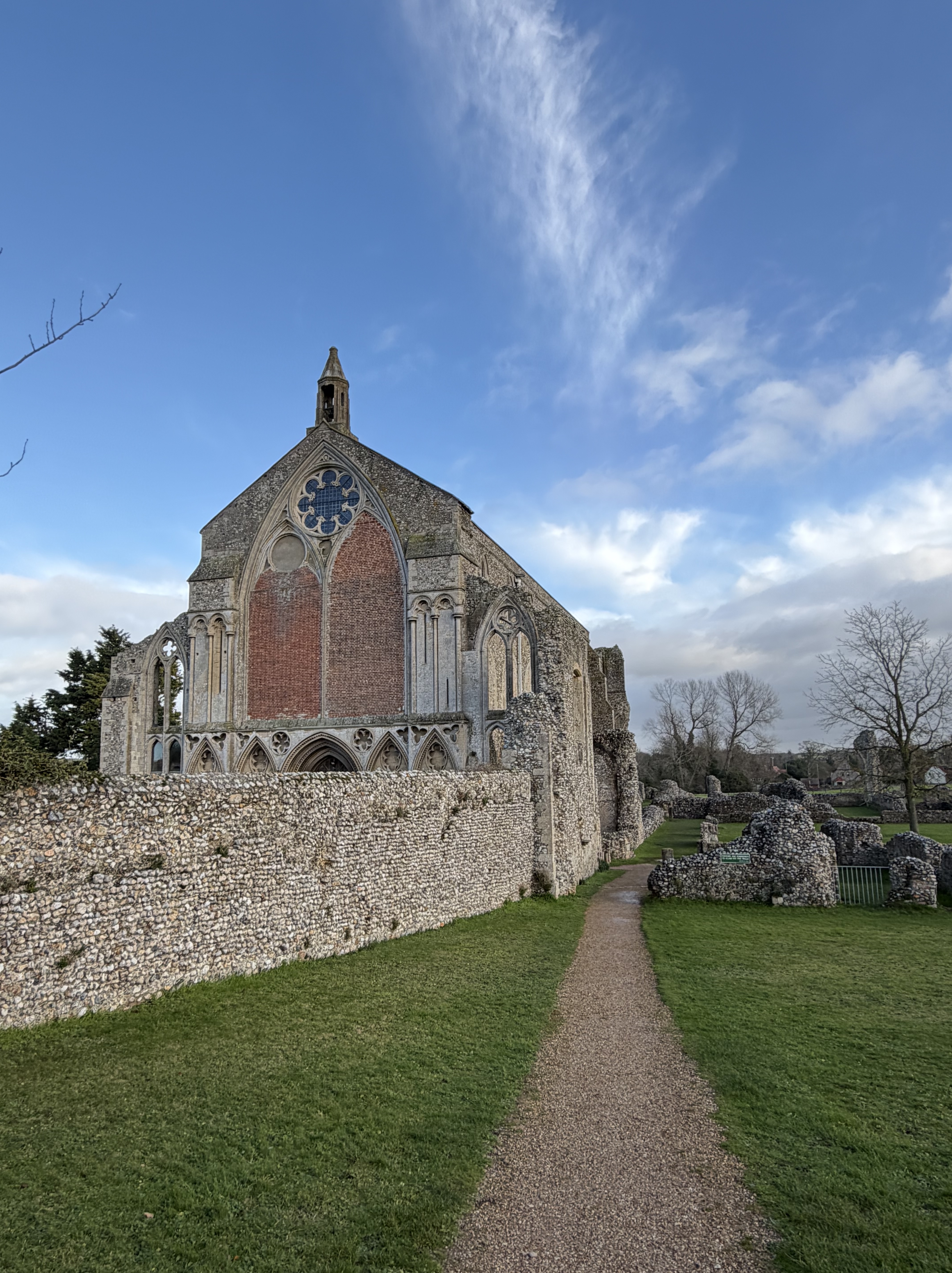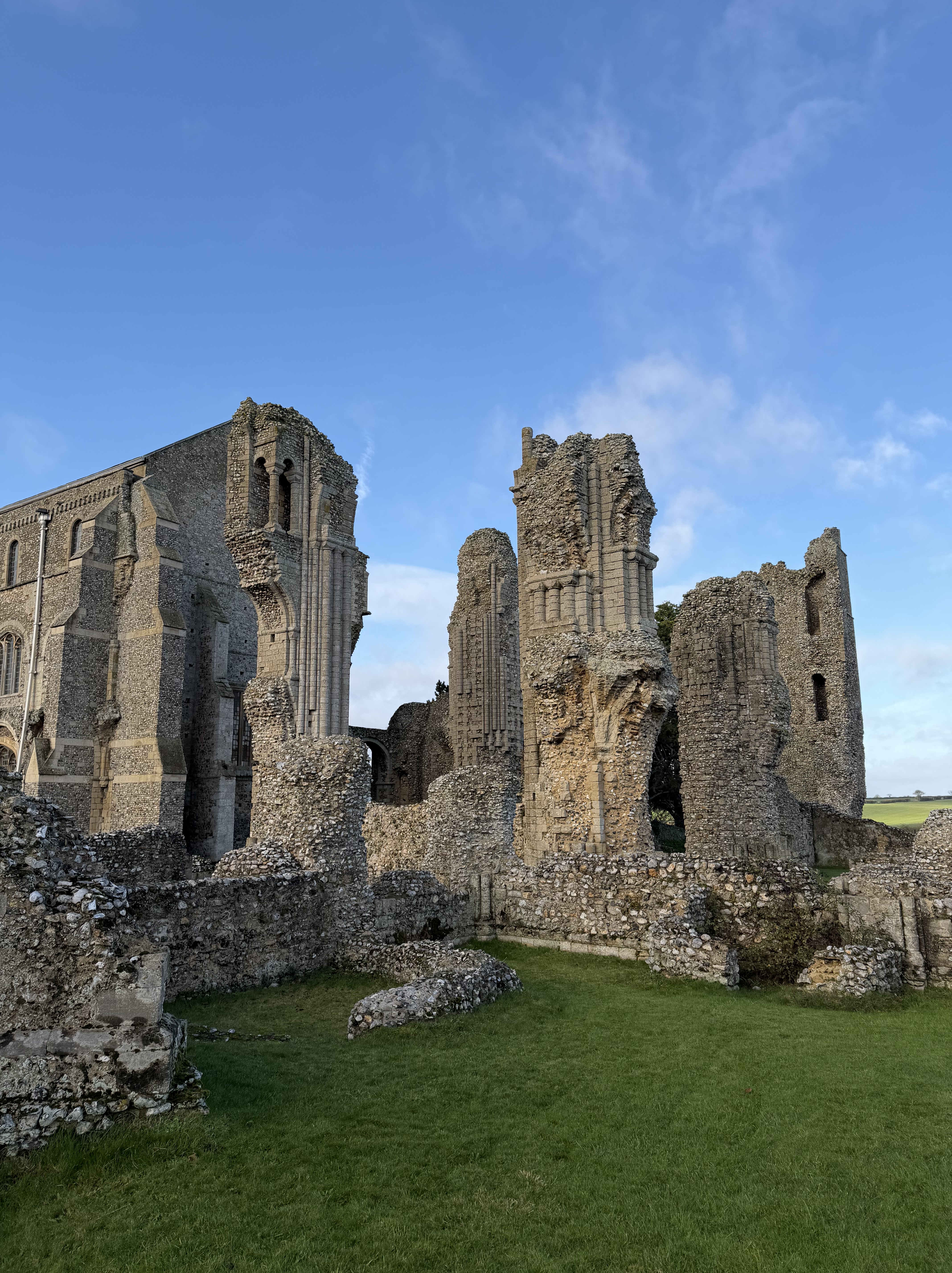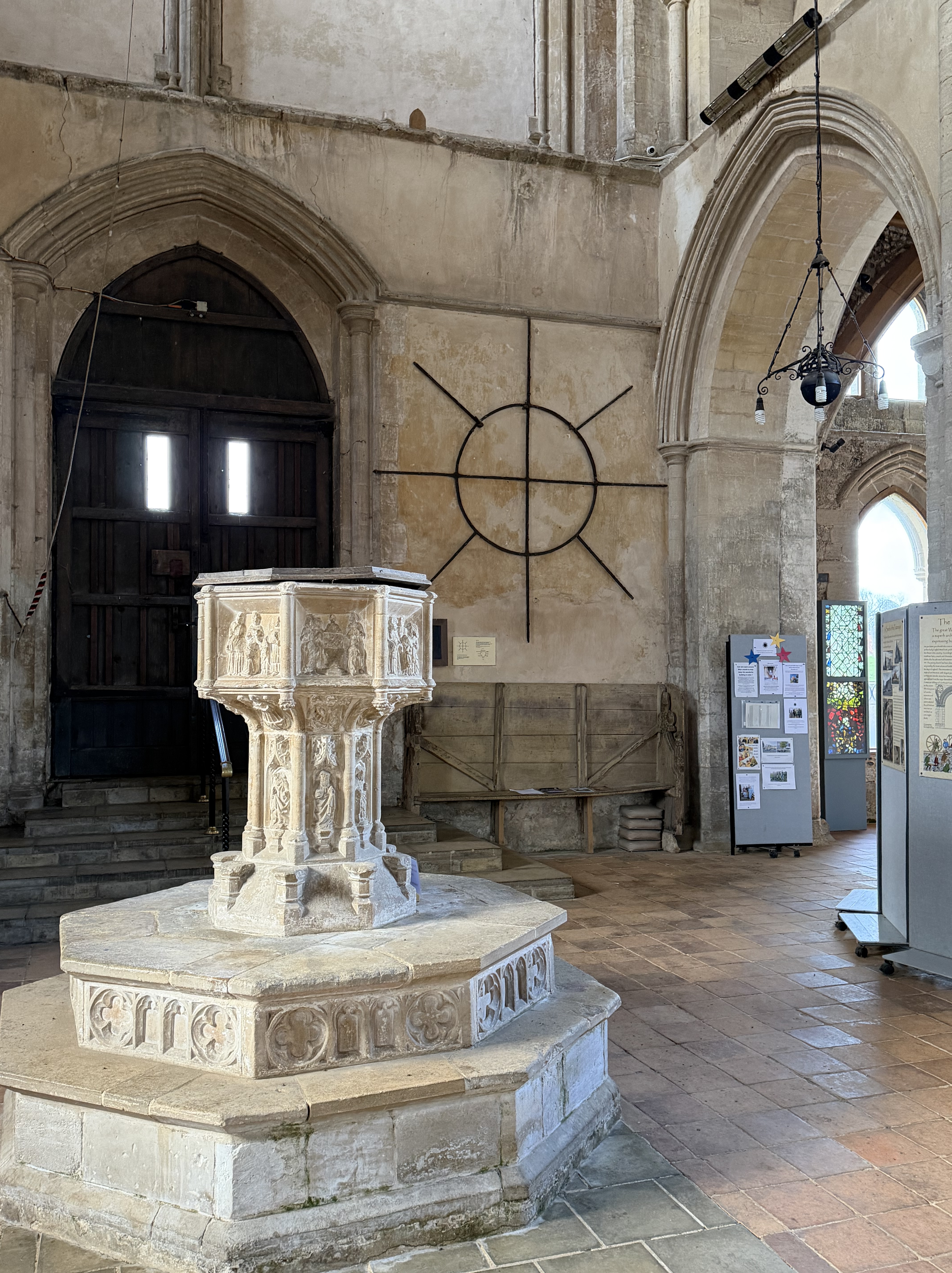 Norfolk is dotted with these kinds of ruins – we have an awful lot of extant Wool Churches as well, but many of the old ruins that followed the dissolution remain wonderful places to visit – and each time I pick out something new to admire; this visit it was the lectern with its wording and the original iron frame for the round stained glass window on the wall behind the font – living, visible history.