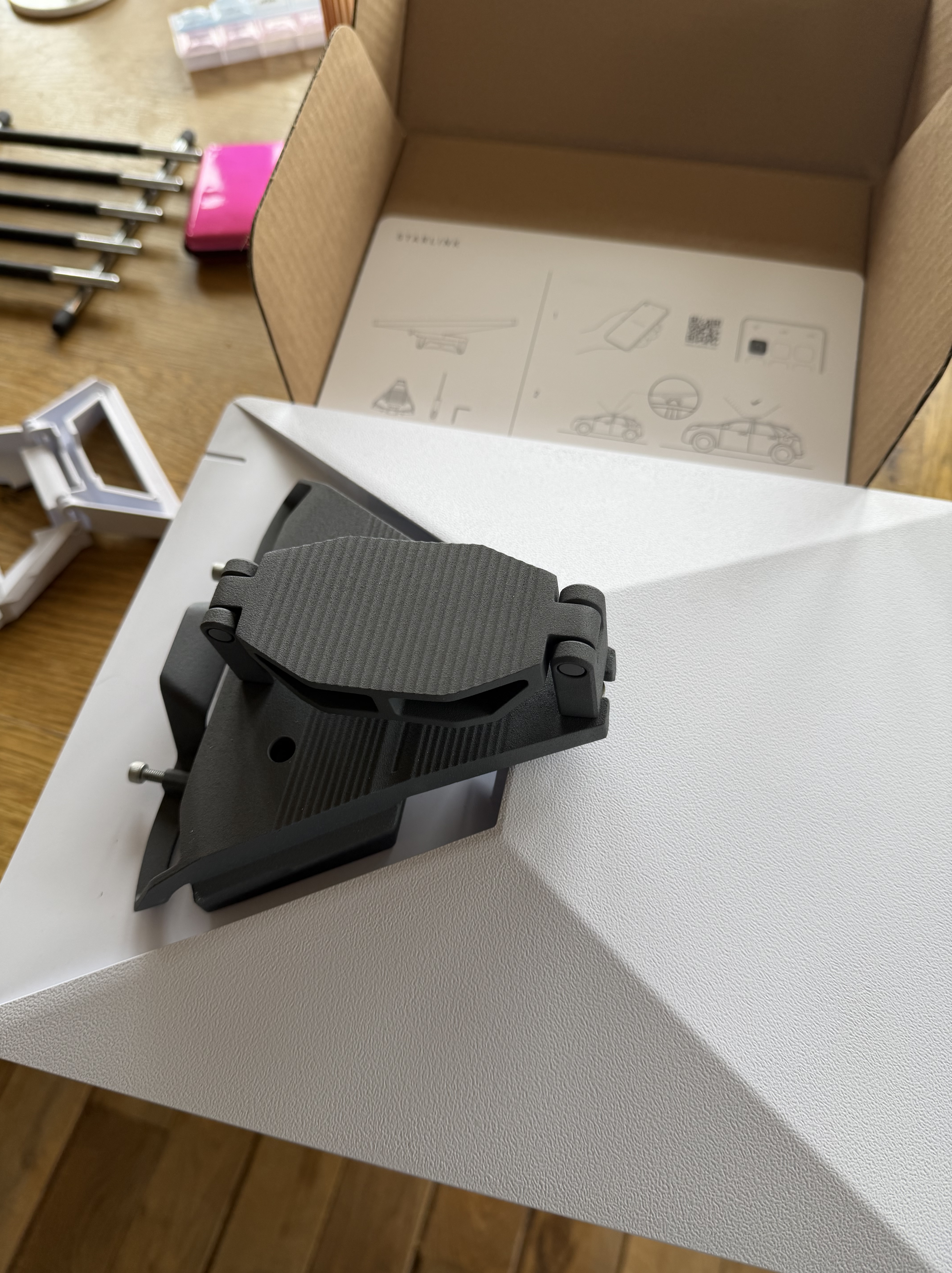 When I bit the bullet and bought the kit, I realised that I wanted to mount it on the roof bar, so I bought the genuine roof rack attachment from starlink. The whole thing when it arrived shocked me – there was a mains plug, a long length of lead and the white square of the unit itself. bearing in mind I still had the ability to drop a lead down the cooker vent shaft that I had used earlier, that sounded like a cunning plan to me! I then got greedy – having read that starlink will work while driving, I realised that I wanted that as an option as well…..