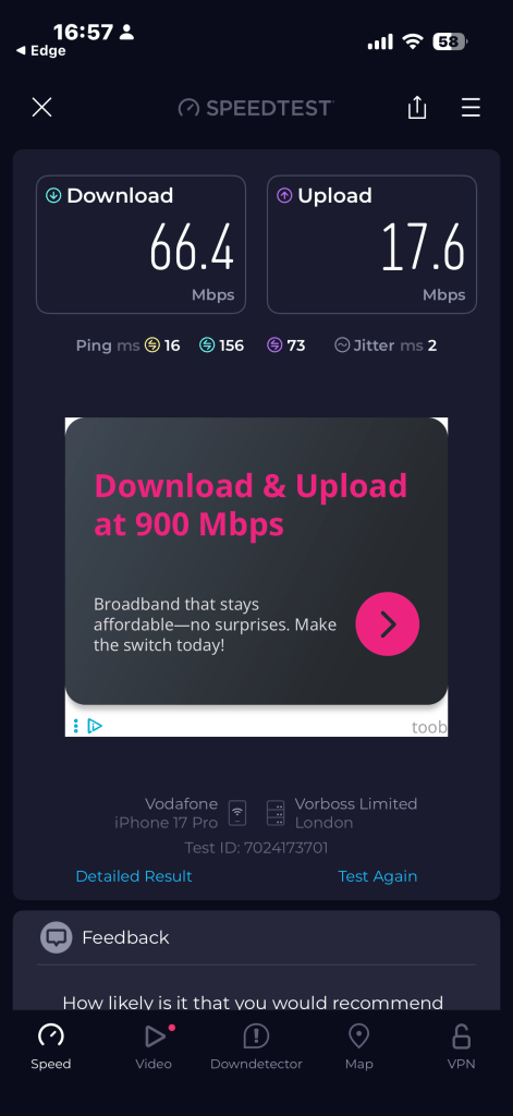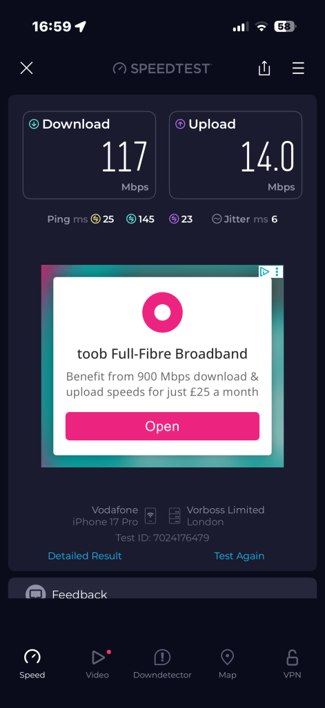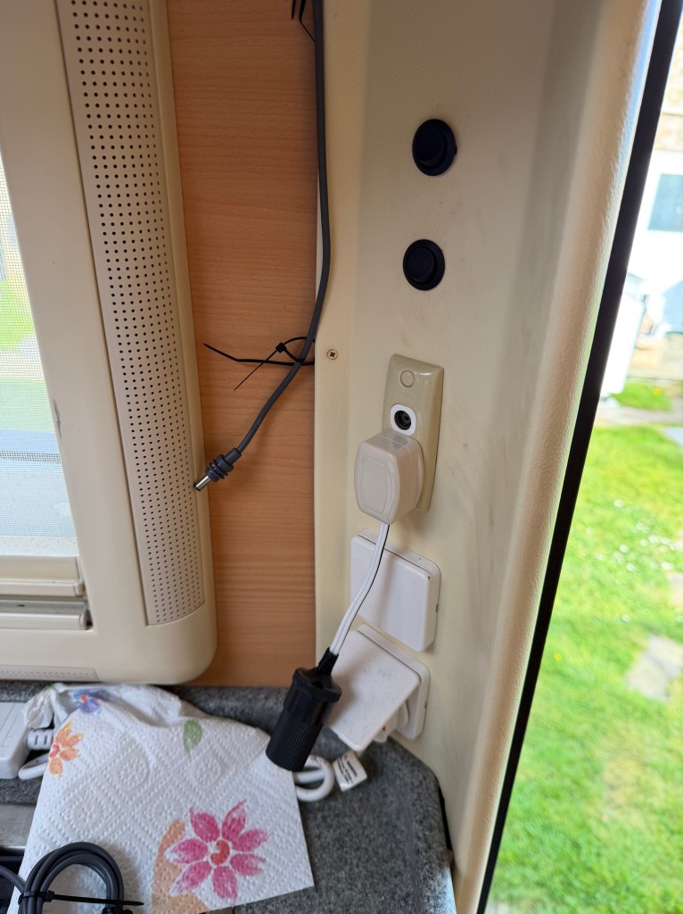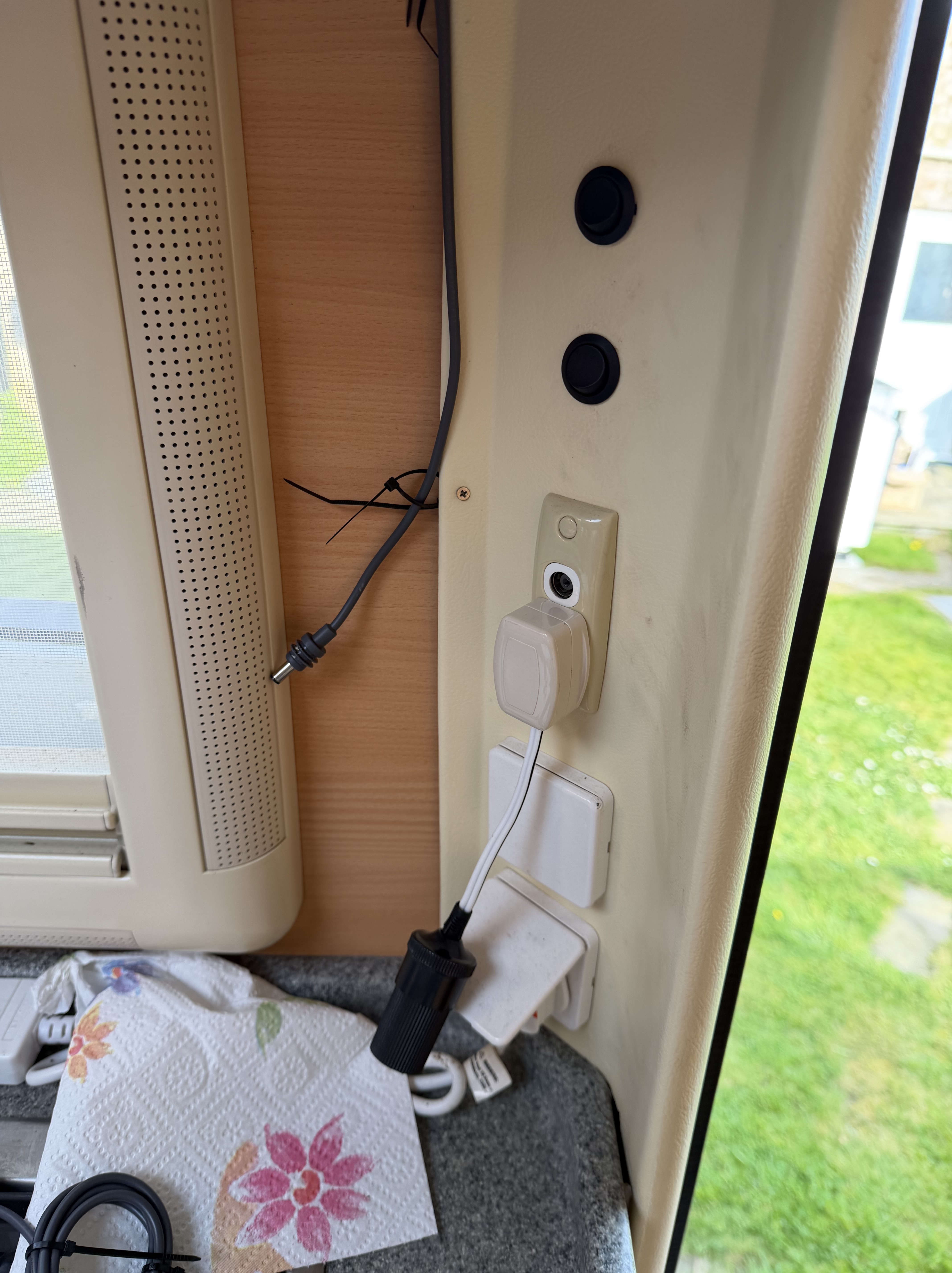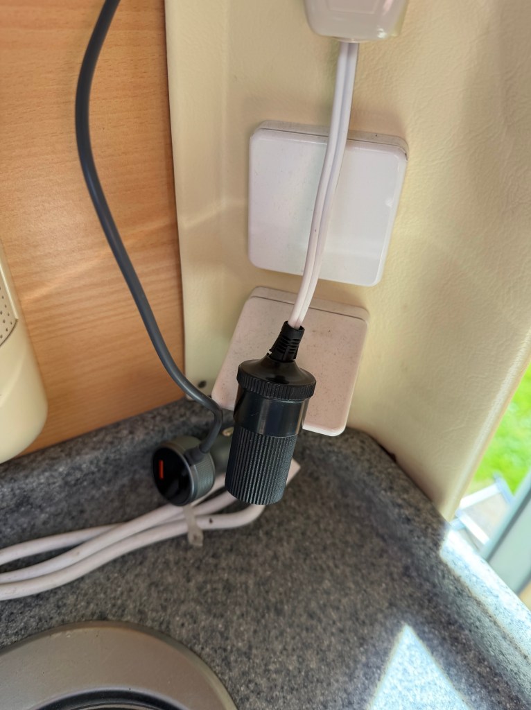 The first thing I did, was to check that it worked – call me a bluff old traditionalist, but I would rather spend the time checking it works then once I am certain it works! Once I had it set up in the middle of the garden, I ran a simple speed test from my phone – and for shit and giggles I ran the same test connected to my home broadband – the results are above! That made me quite excited, as it would mean full 4k/UHD LUFC match coverage 🙂 I have two of the old style 12v sockets, one hidden by the tv cupboard in the rear of Ziggy, and one by the main entrance, which is where I had made a TV bracket for us to use. I worked out that I could use an adapter to take the starlink cable and convert it to a male cigarette adapter that would then plug in – so, a swift perusal of the options led me to order the right part off amazon.
