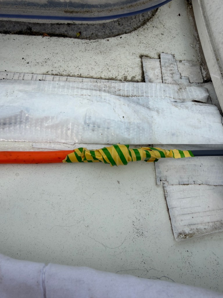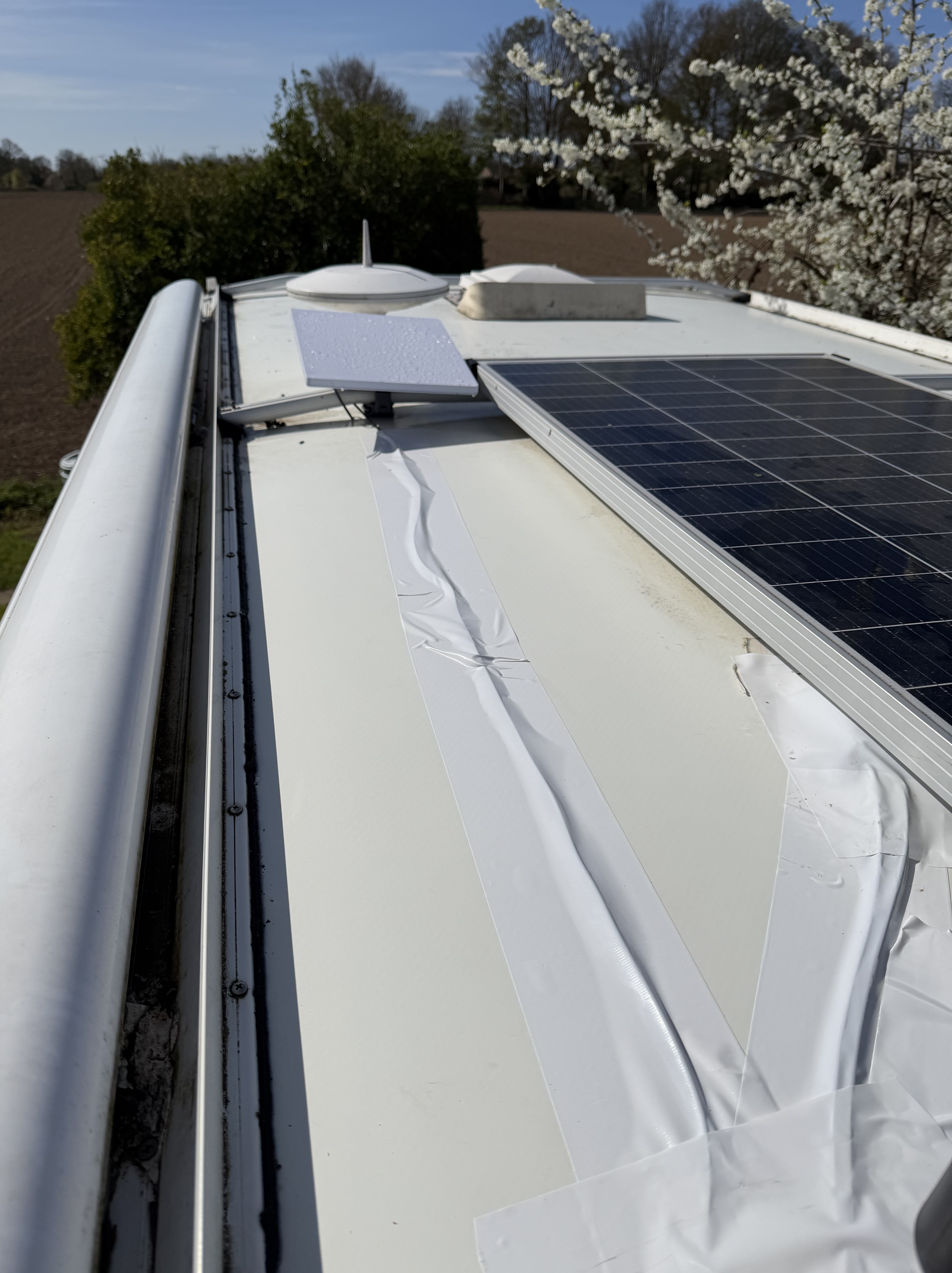 Please note – the roof was ringing – so was given a bit of a clean up! Next up, was to secure the starlink to the oil, and to make good – I like the old adage of measure twice, cut once, and I must have checked which way round the mount fitted six times – but, I got it right. Sods law dictated that the roof bar mount was too big for the rail – so I used two bolts laid opposite to each and secured with insulating tape to act as a sold shim. Once that was done, the Allan key bolts were tightened up and the cable attached – job’s a good ‘un! I then rough connected everything and checked it was all working. Once that was confirmed, I used some extra wide gorilla tape and secured the cables for the starlink, the solar panels and the mi-fi. (Not happy with the wrinkles – to be redone!)